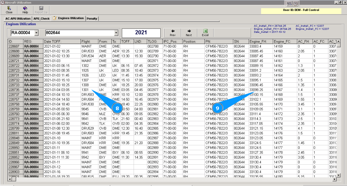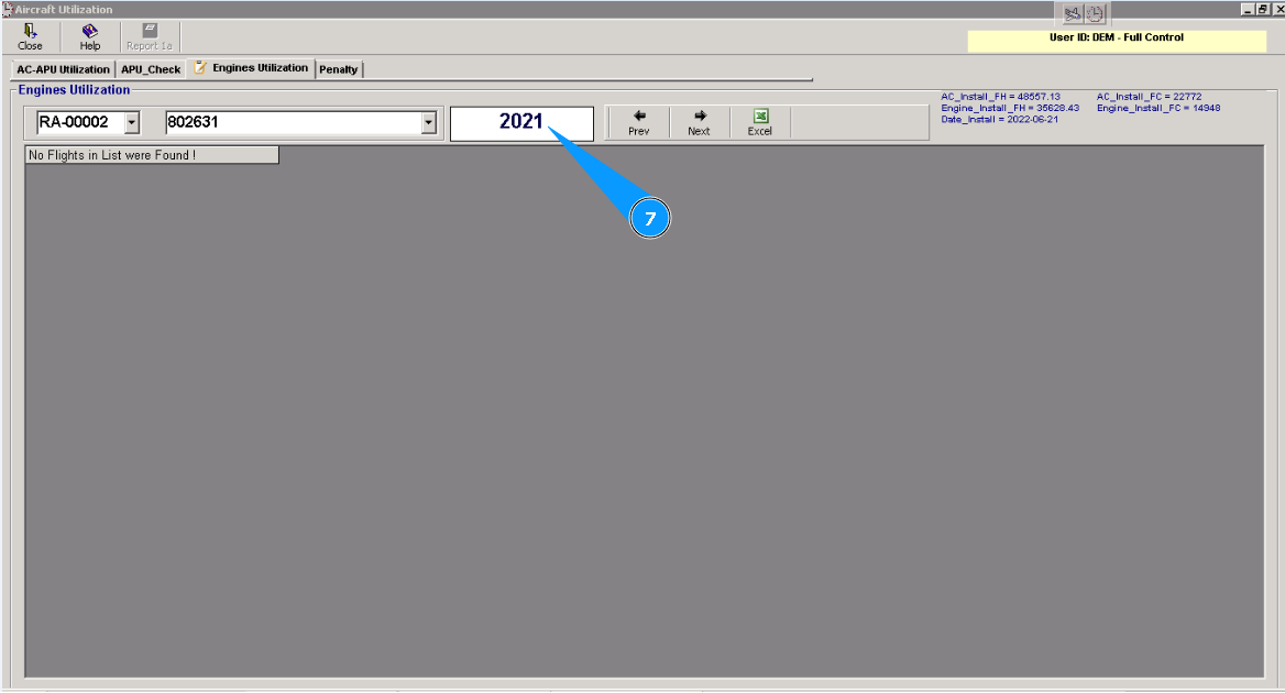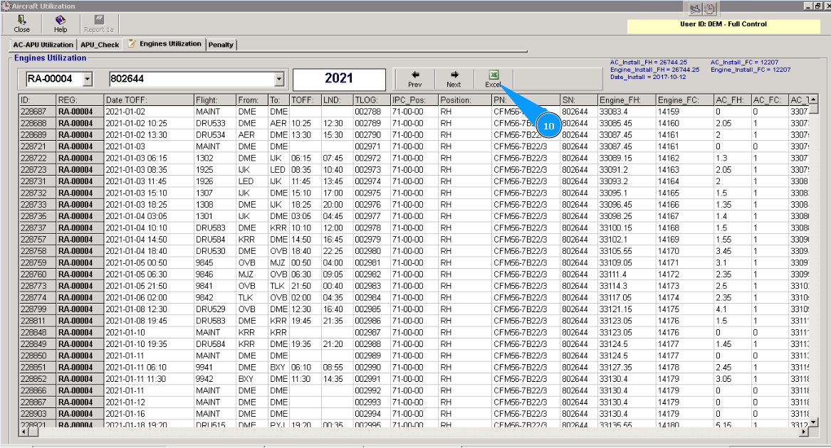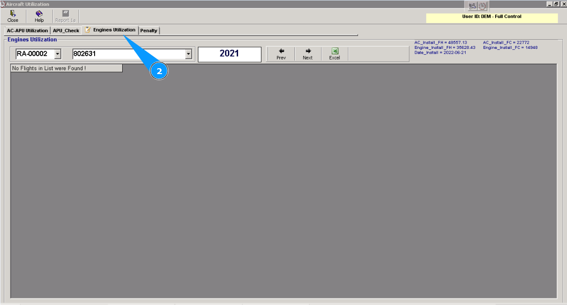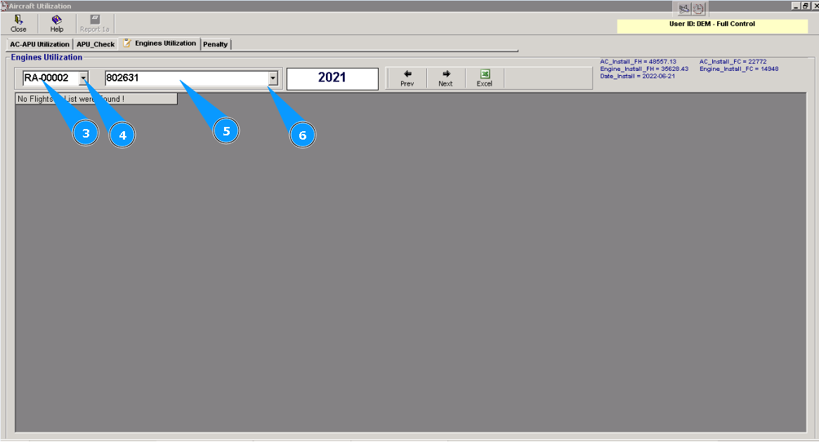 3. Enter the aircraft registration number in the window "Engines Utilization".