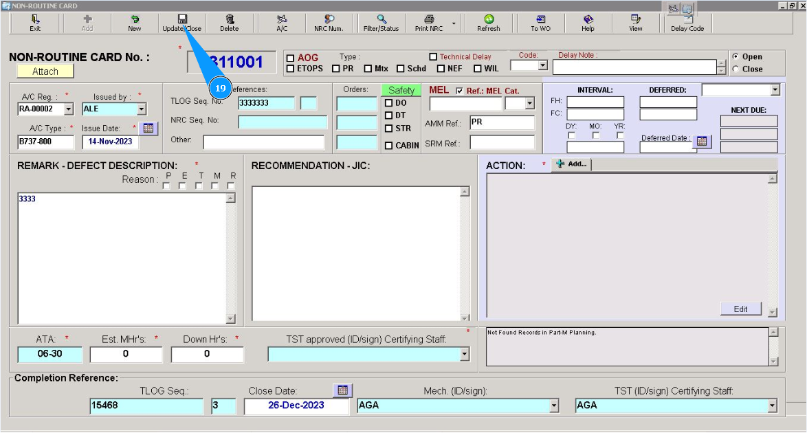 19. Click on the button "Update/Close", to close NRC.