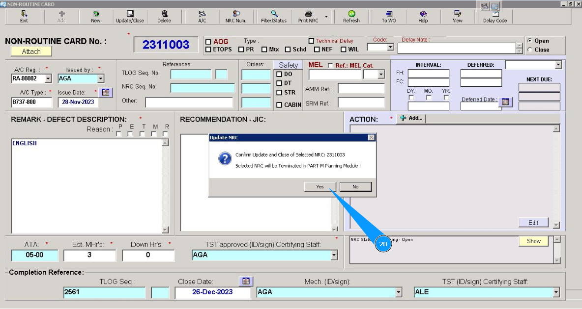20. Click on the button "Yes", to confirm closing the NRC.