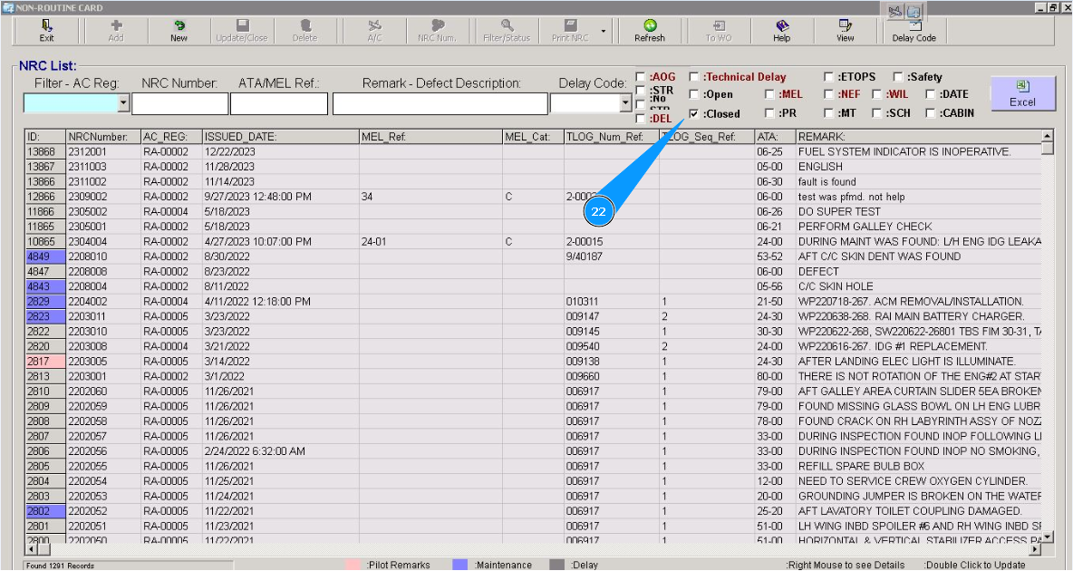22. Check that a closed NRC is presented in the window "NRC List", apply filter "Closed", tick in the window "Closed".