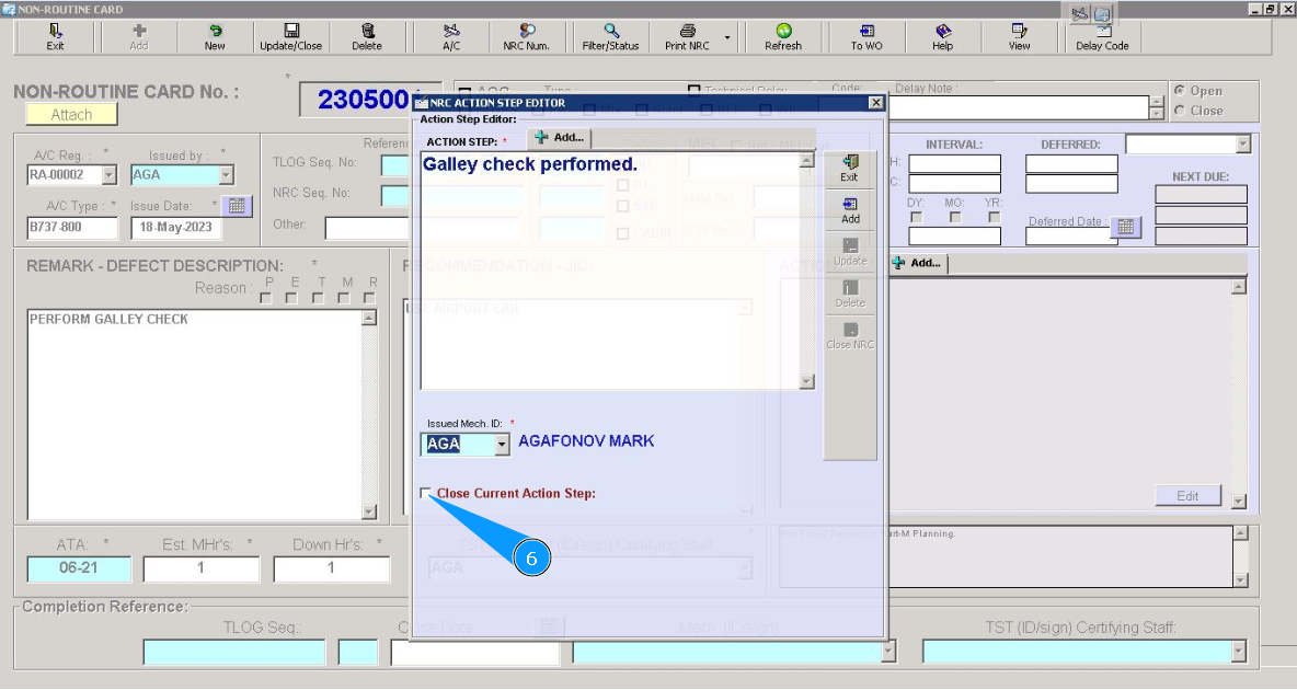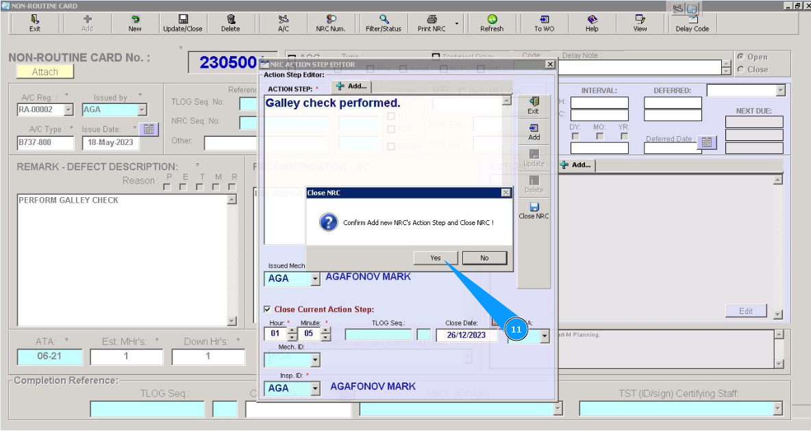 11. Click on the button "Yes", to confirm the closing step and NRC.