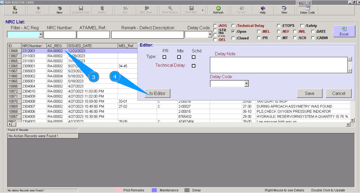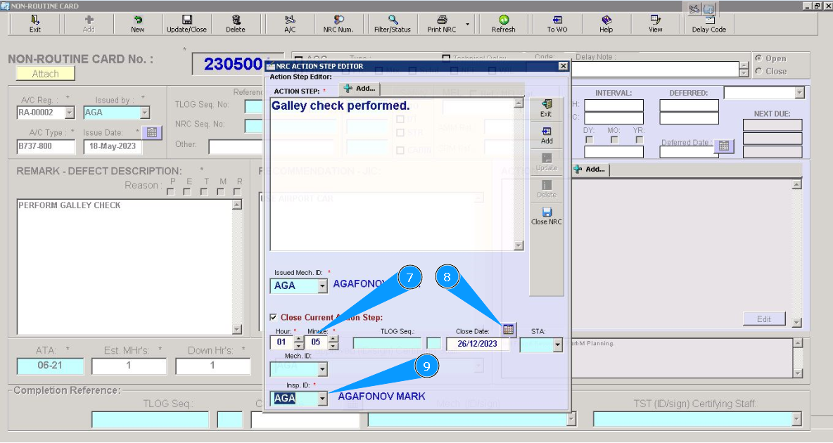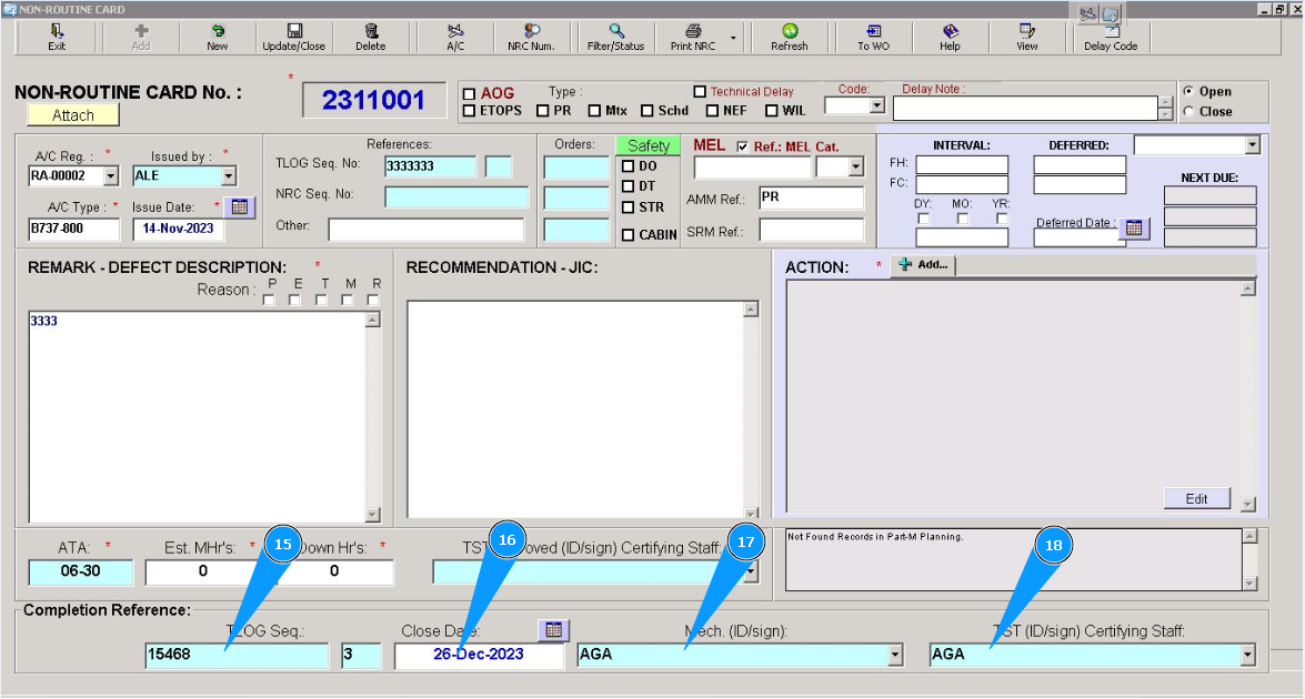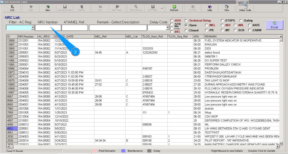 2. Enter an NRC number in the field "NRC Number", for the corresponding NRC. Note: If you do not know the NRC number, please use the following searching fields: "Filter-AC Reg.", "ATA/MEL Ref." or others available in this submodule.