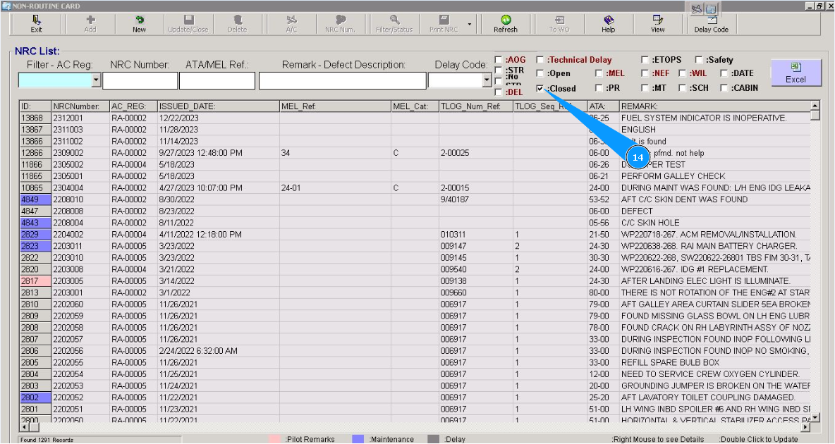 14. Check that a closed NRC is presented in the window "NRC List", apply filter "Closed", tick in the window "Closed".