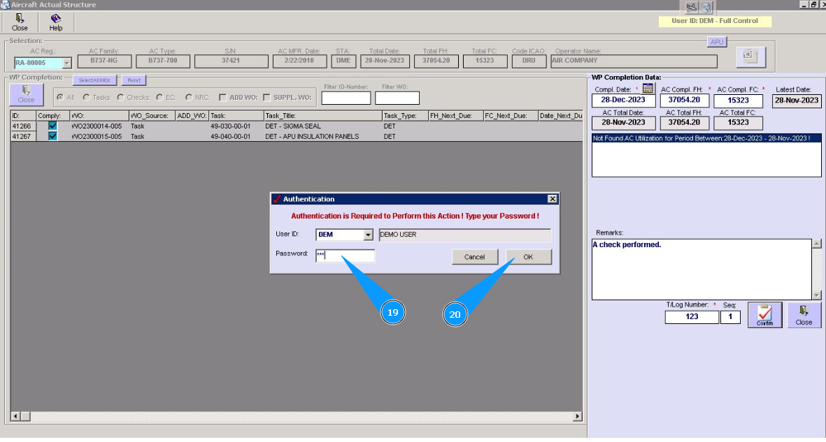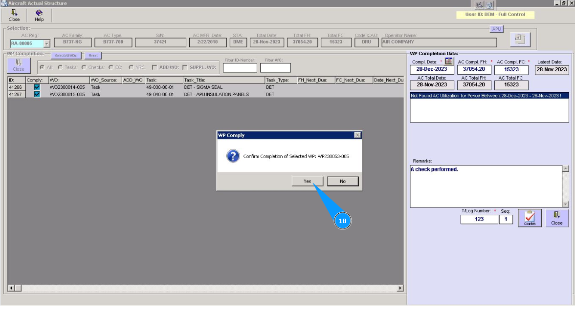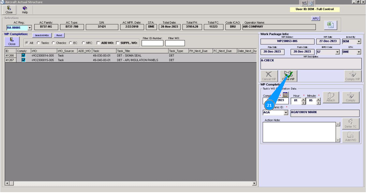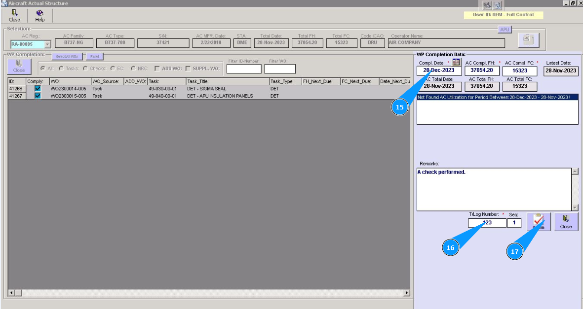 15. Enter the performance date of WP or select it in the calendar. Note: utilization in the fields "AC Coml. FH" and "AC Coml. FC" will be automatically presented, depending on the selected date of WP closing.