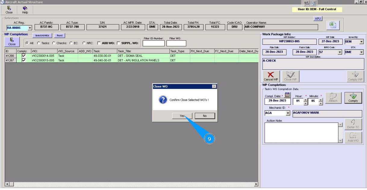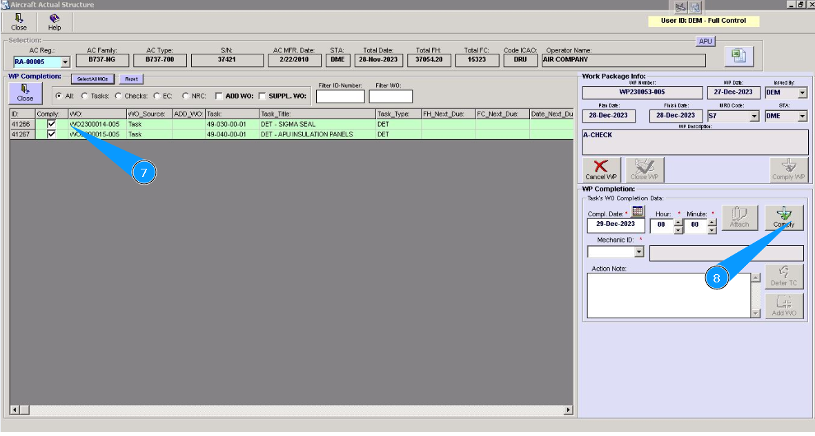 2. Enter the aircraft registration number in the list of window "Actual Structure-Select Aircraft Reg.-SN".