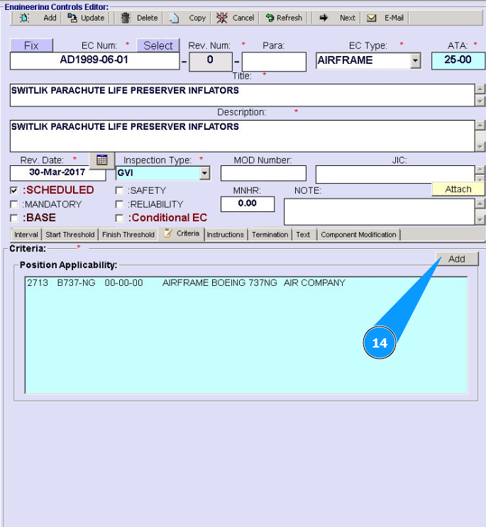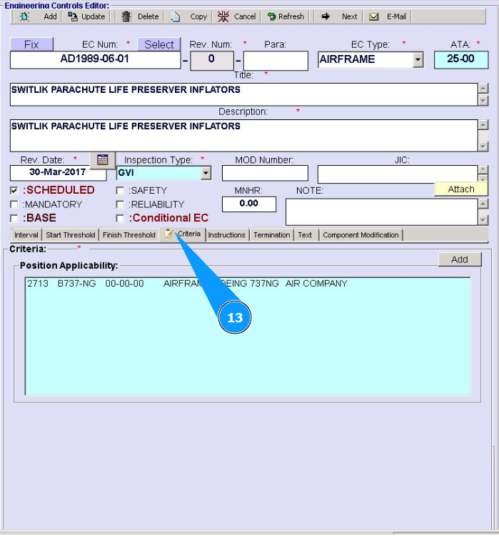 13. Enter data on the relation of this EC to the component position or part number, go to the tab "Criteria".