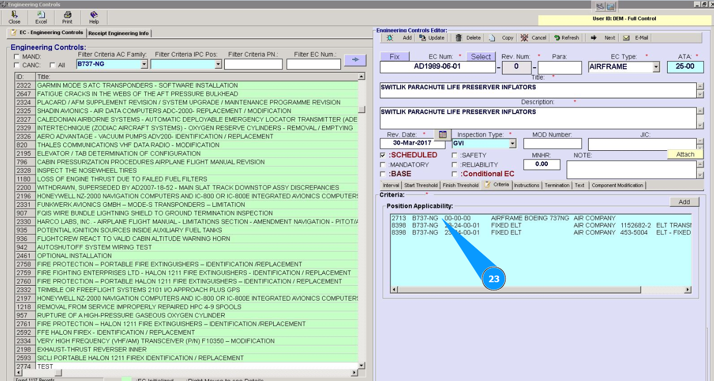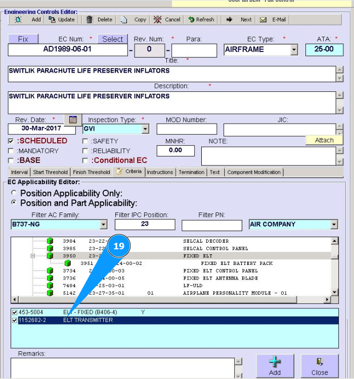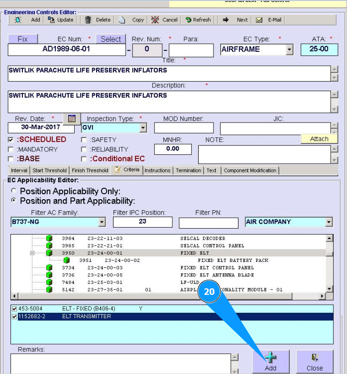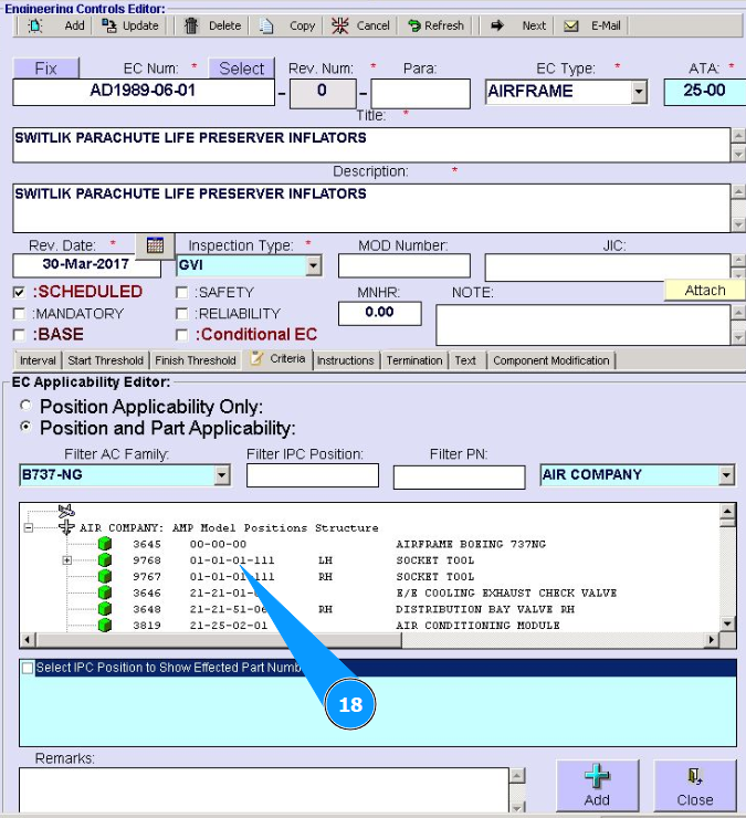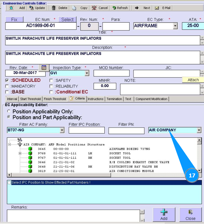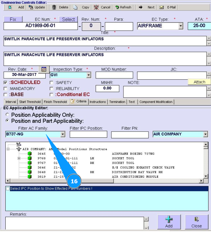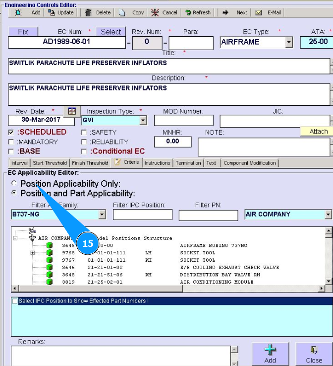15. Select whether the EC corresponds to only the component position or also to batch numbers "Possition Applicability Only" or "Possition and Part Applicability", tick the appropriate box.