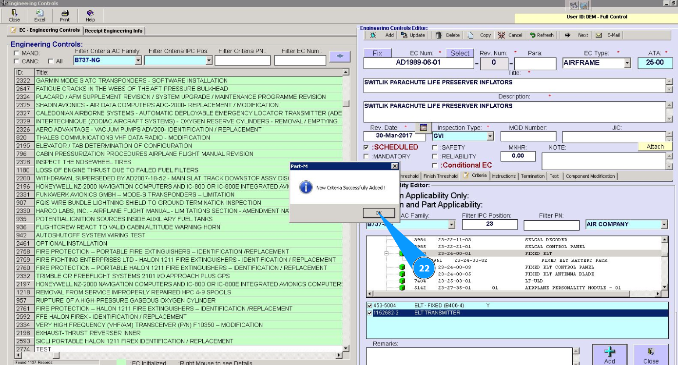 19. If necessary, select the component part numbers for which this EC corresponds, click in the corresponding window.