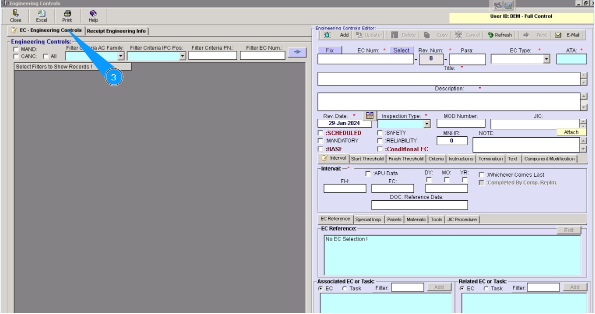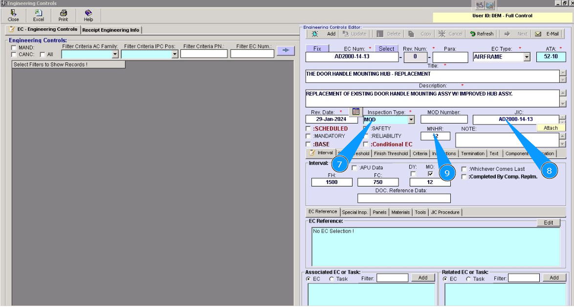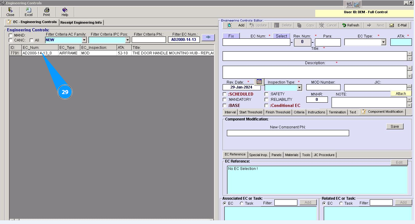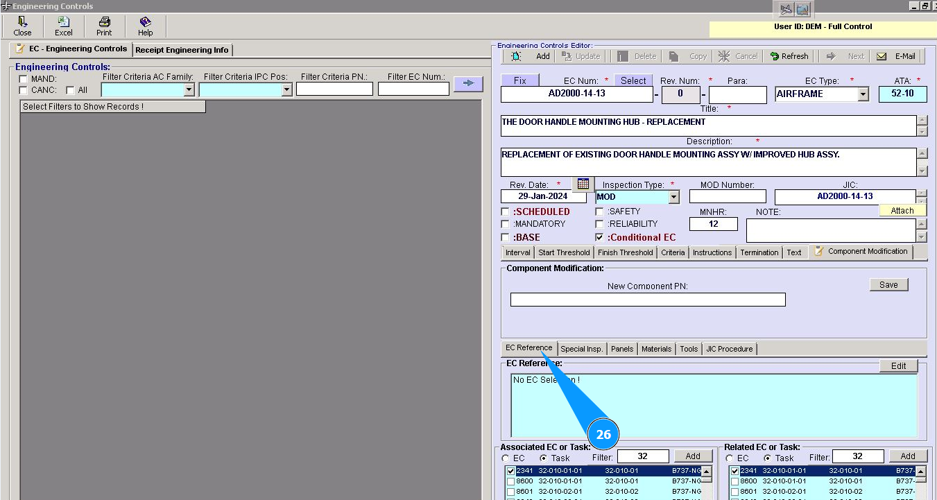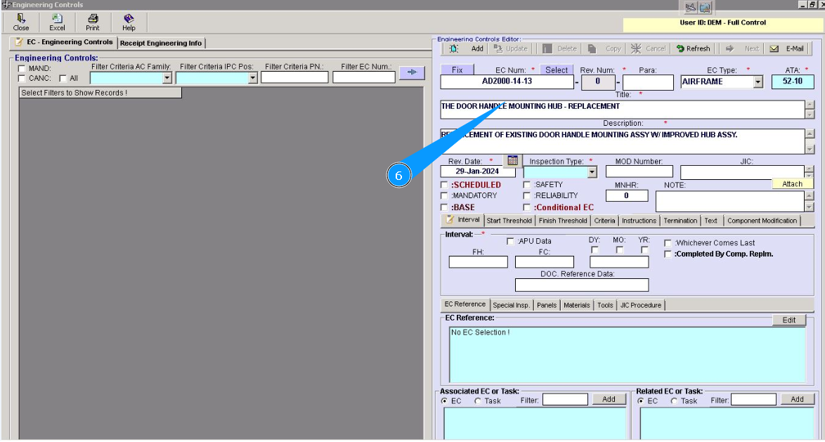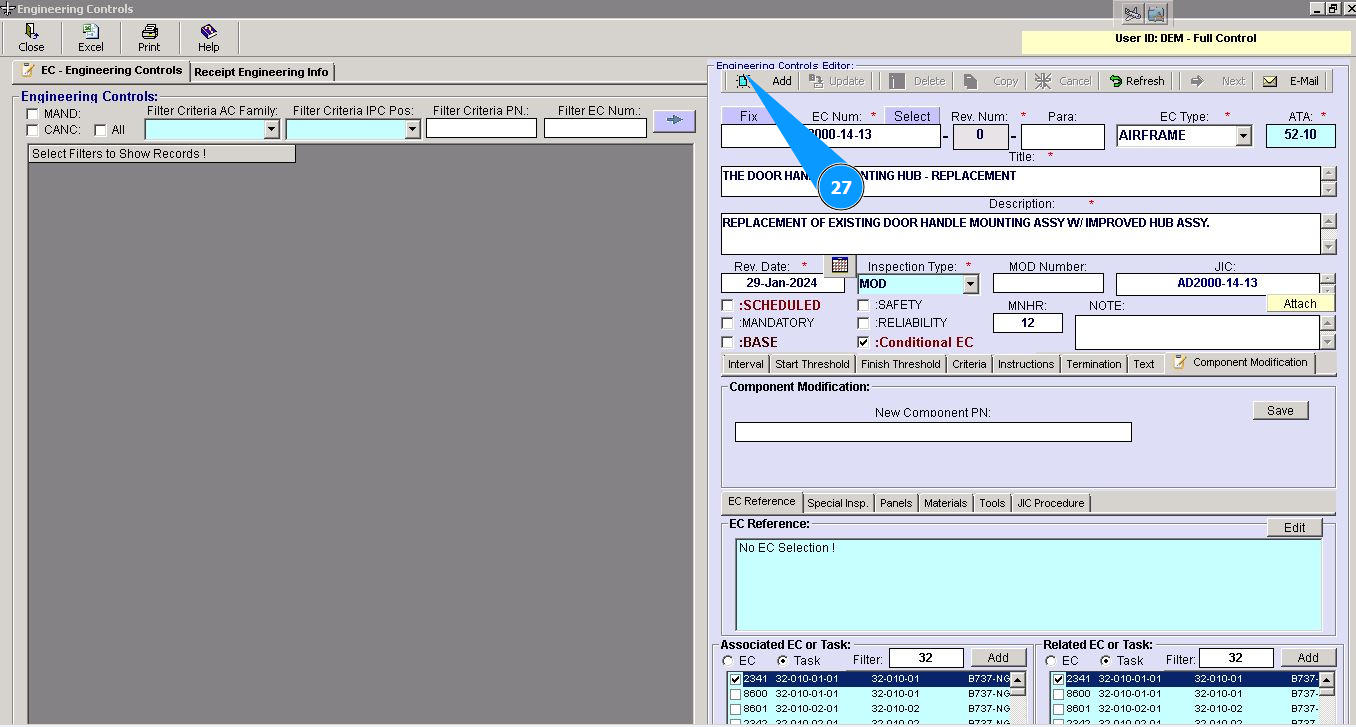6. Check that preliminary information about EC is presented on the screen and that it is corrected in the fields: "EC Num", "Rev. Num", "EC Type", "ATA", "Title","Description", "Rev.Date.".