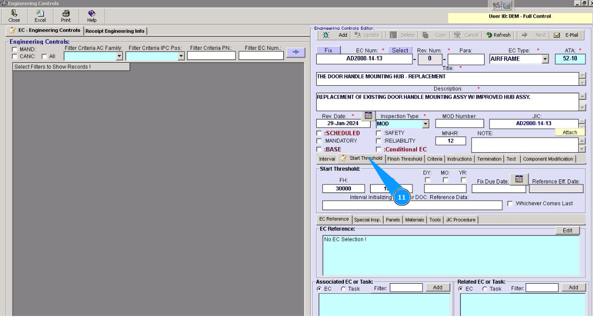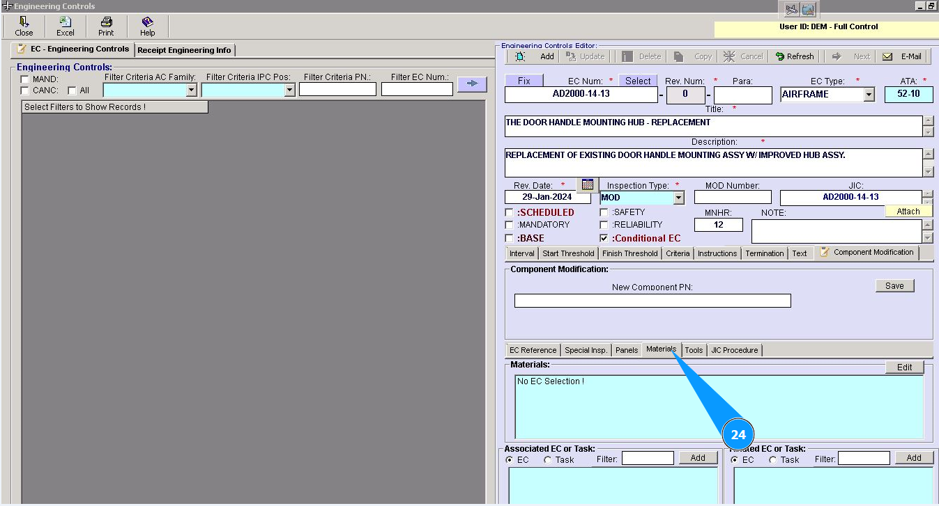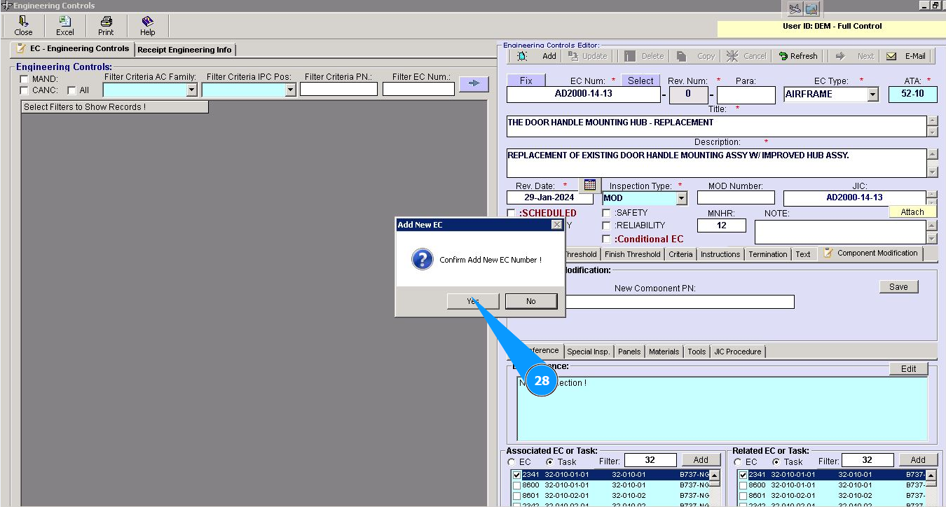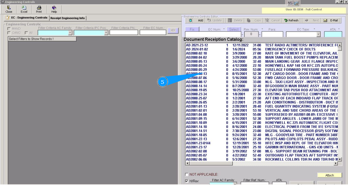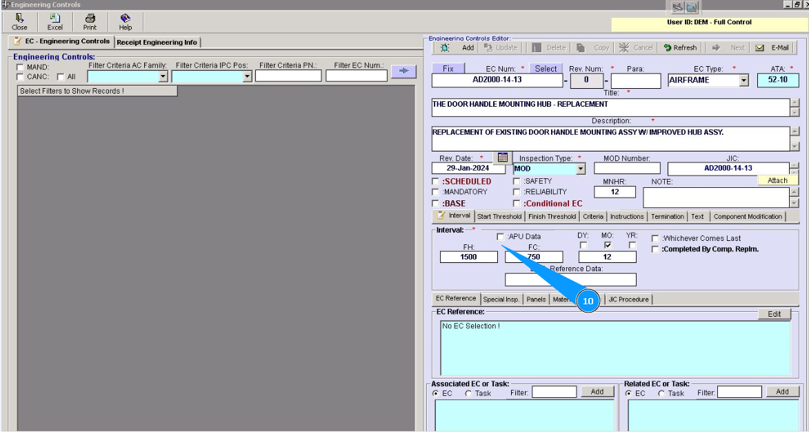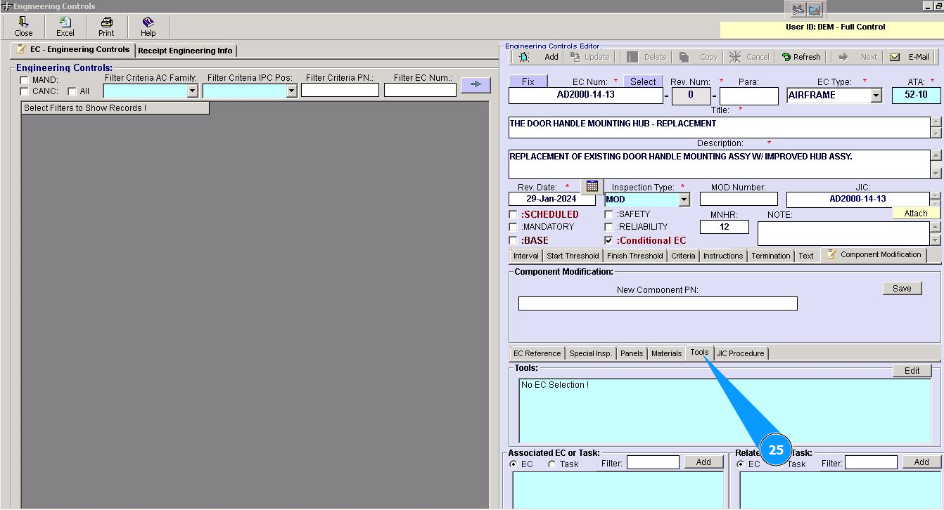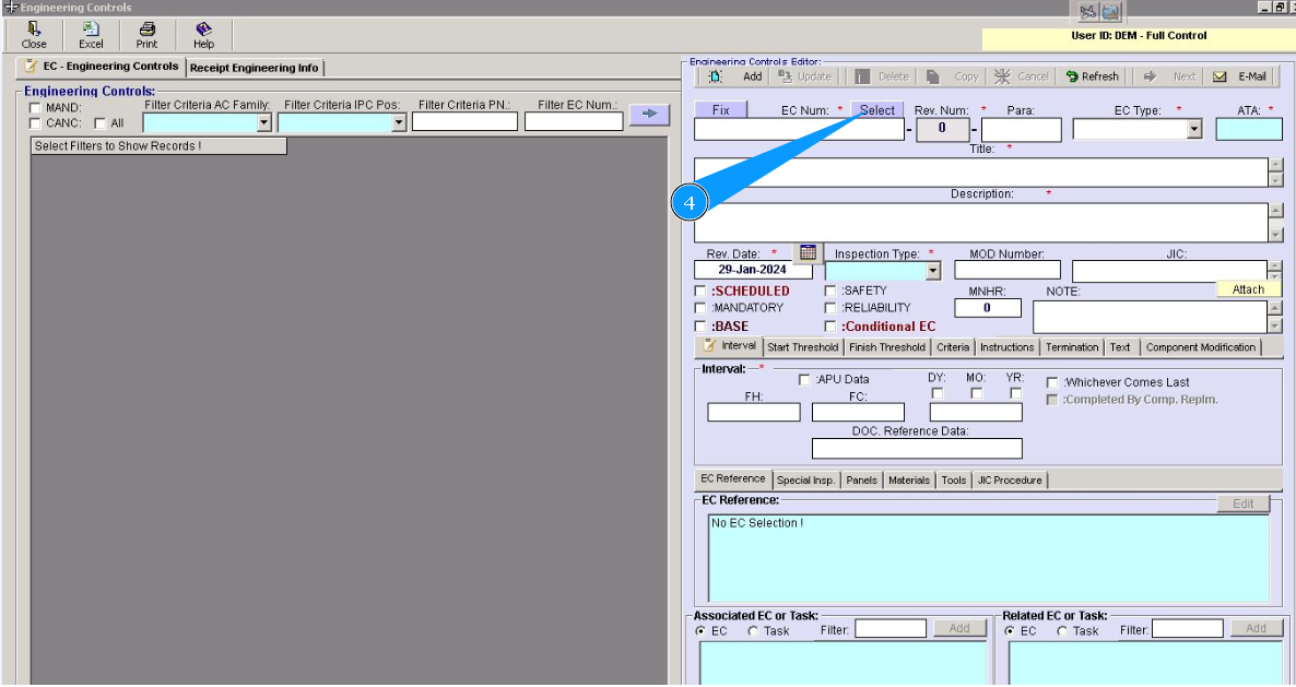 6. Check that preliminary information about EC is presented on the screen and that it is corrected in the fields: "EC Num", "Rev. Num", "EC Type", "ATA", "Title","Description", "Rev.Date.".