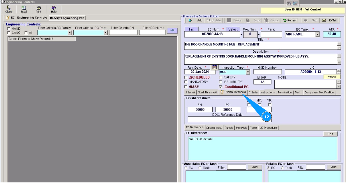 12. Enter the data FH/FC of the finish threshold for performing EC in the tab "Finish Threshold".