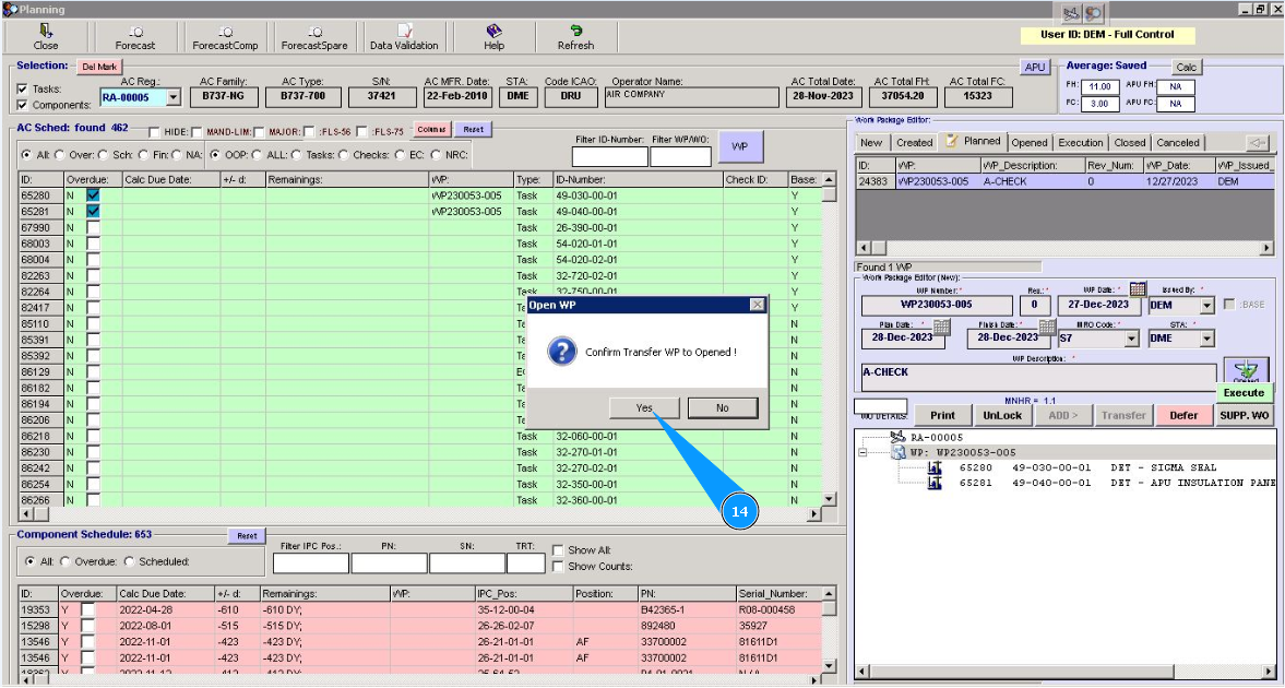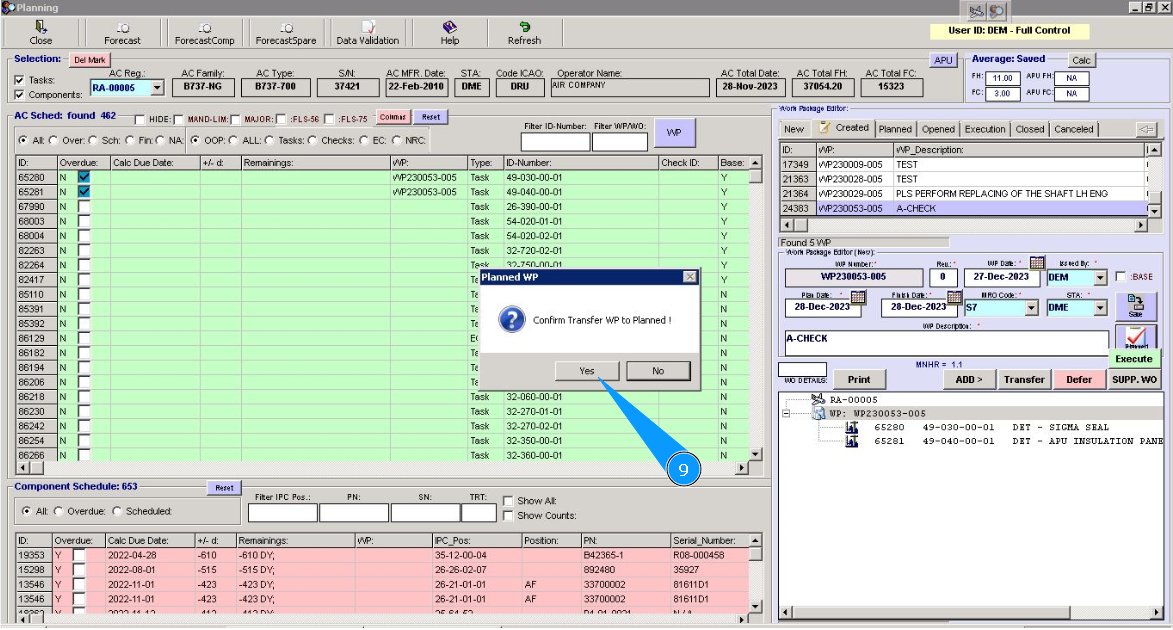 9. Click on the button "Yes", to confirm transferring Work package to the "planned" condition.