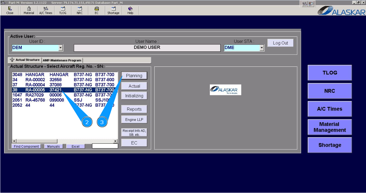 2. Select aircraft registration in the list of window "Actual Structure-Select Aircraft Reg.-SN".