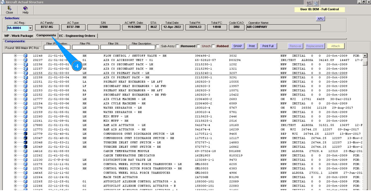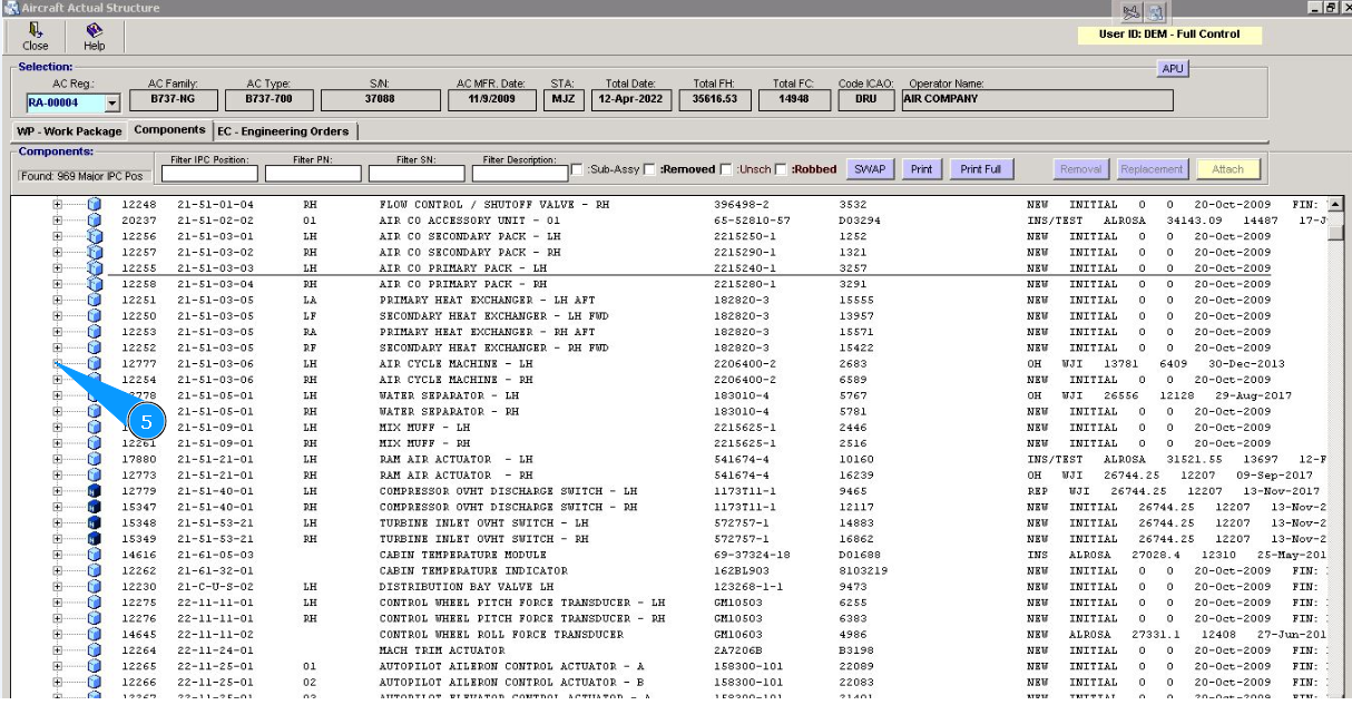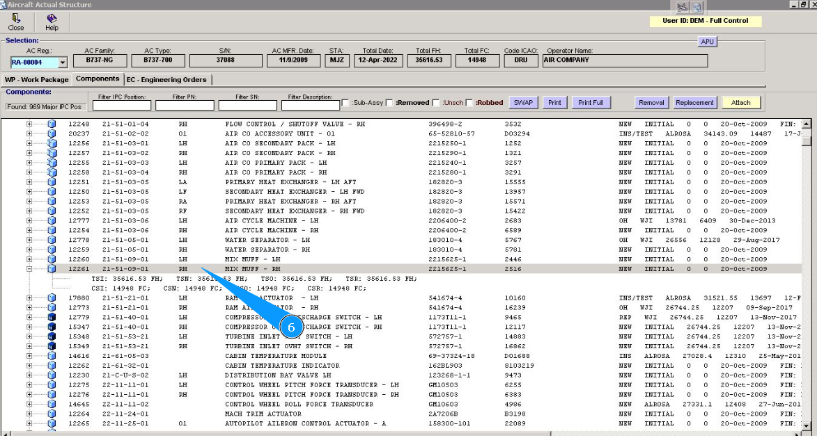2. Enter the aircraft registration number in the list of window "Actual Structure-Select Aircraft Reg.-SN".
