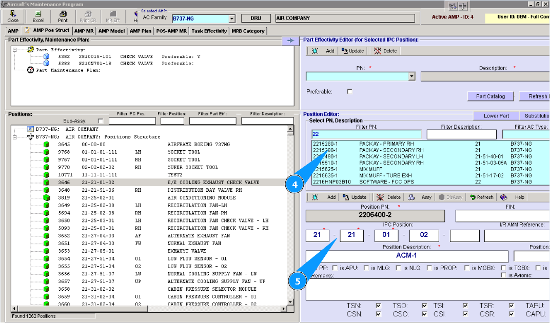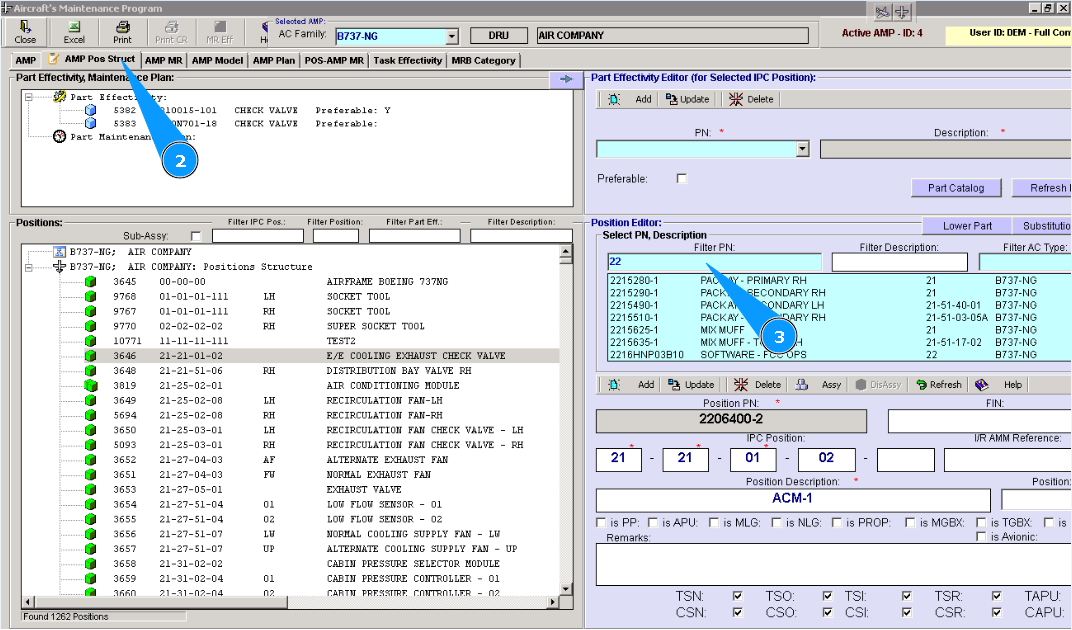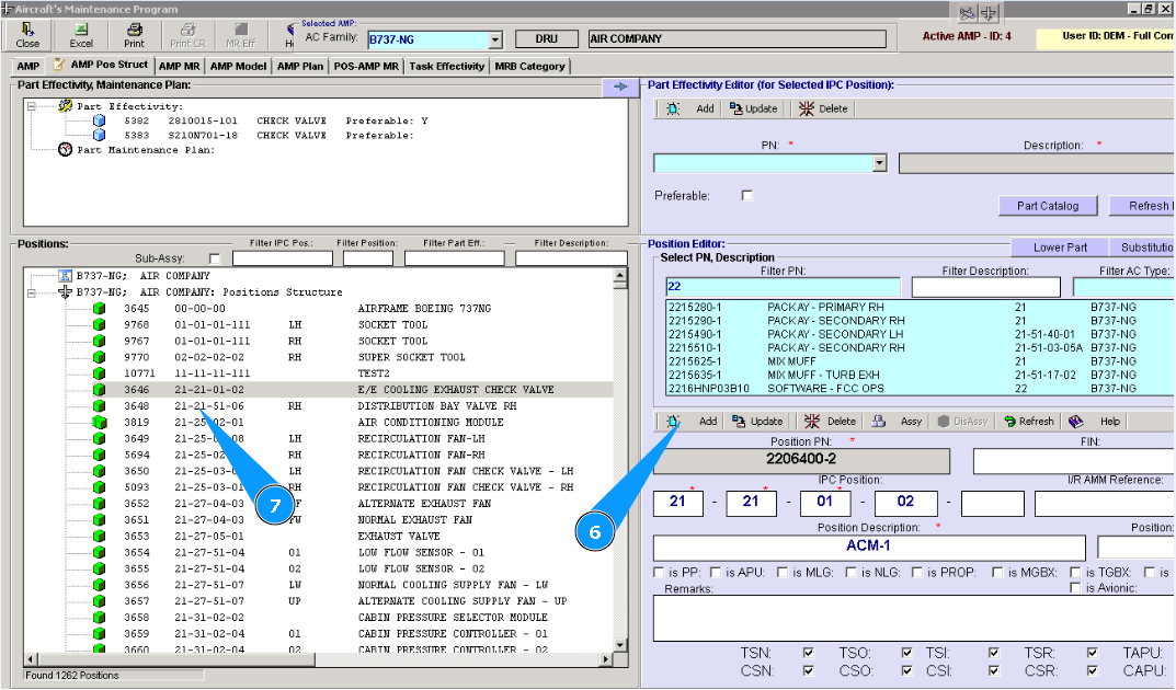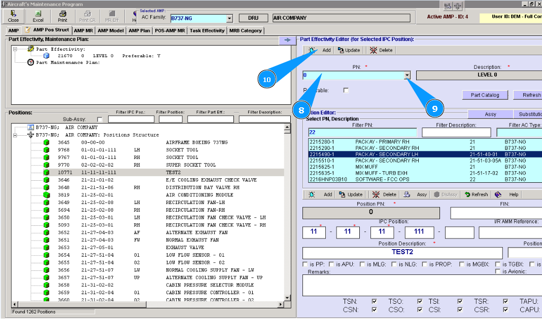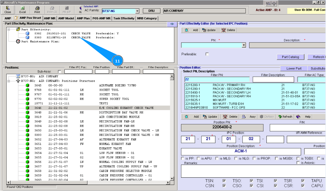 11. Check that a new line with the part number is created in the window "Part Effectivity, Maintenance Plan". Note: If necessary, enter all applicable part numbers to create the AIPC position. For this reason, repeat items 8–11 of this instruction.