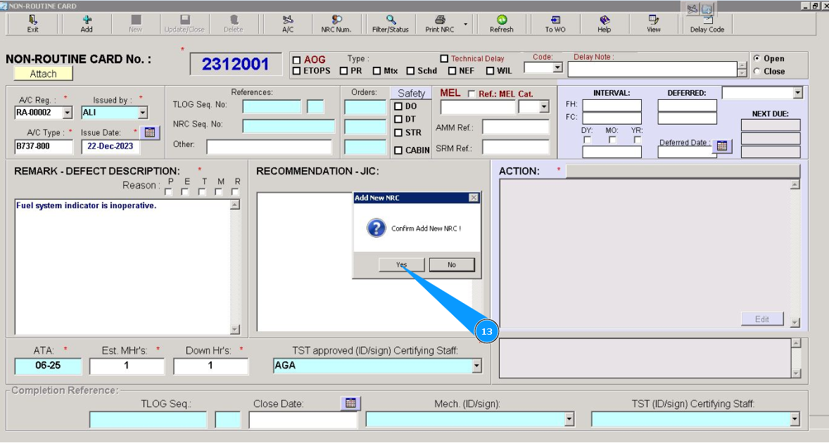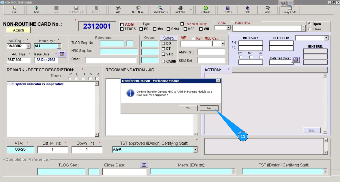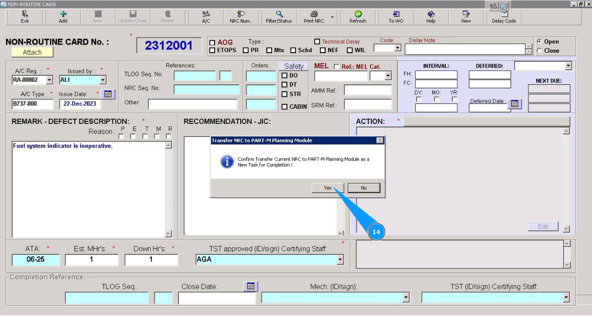 14. Click on the button "Yes", if your created NRC should be planned in the "Planing submodule" for deadline control. /images/how_to/Part-M/How_to_create_NRC_7.png