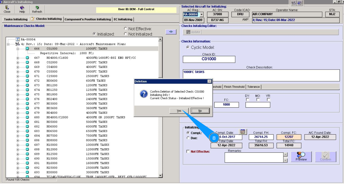 8. Click on the button "Yes", to confirm deletion of initializing check.