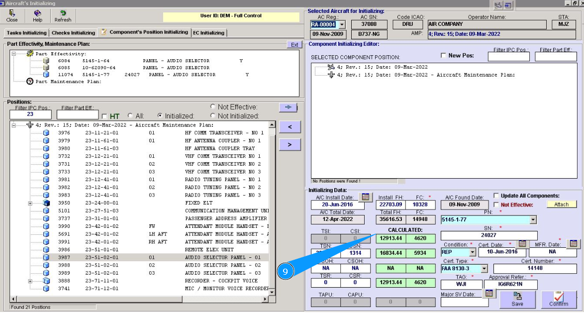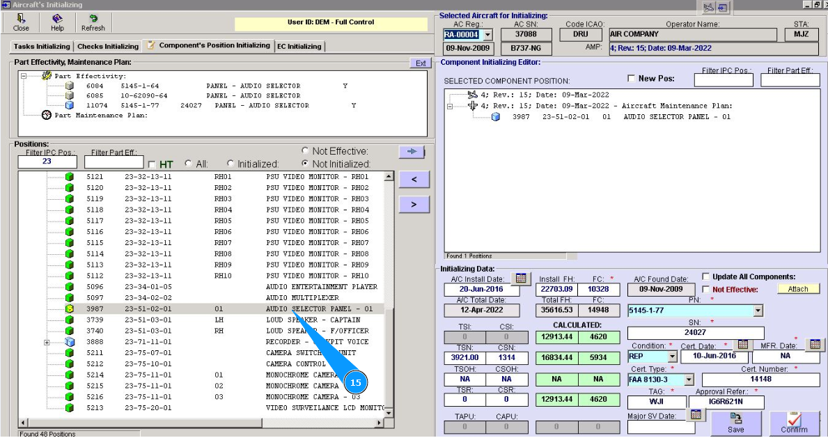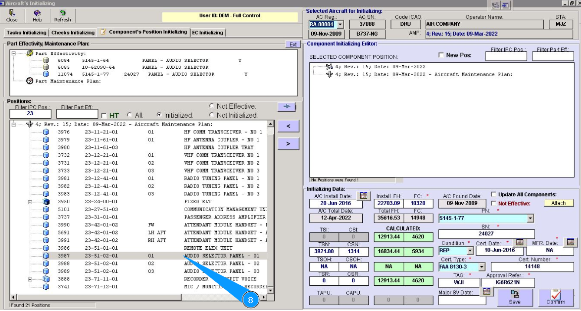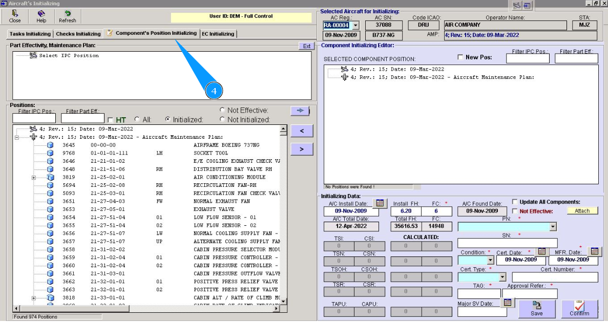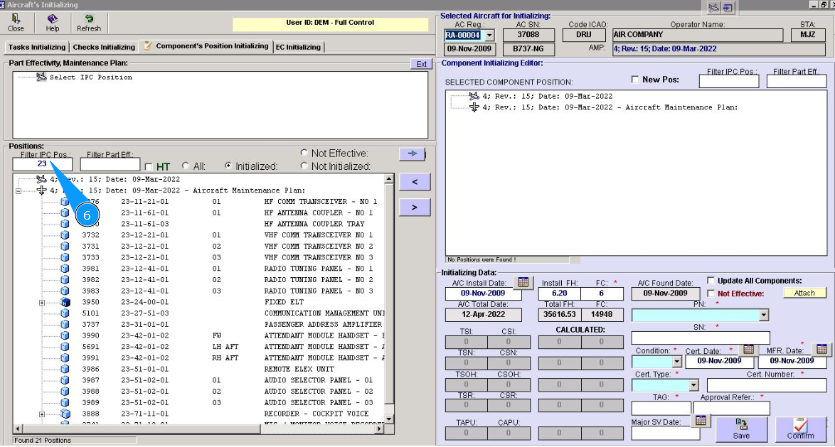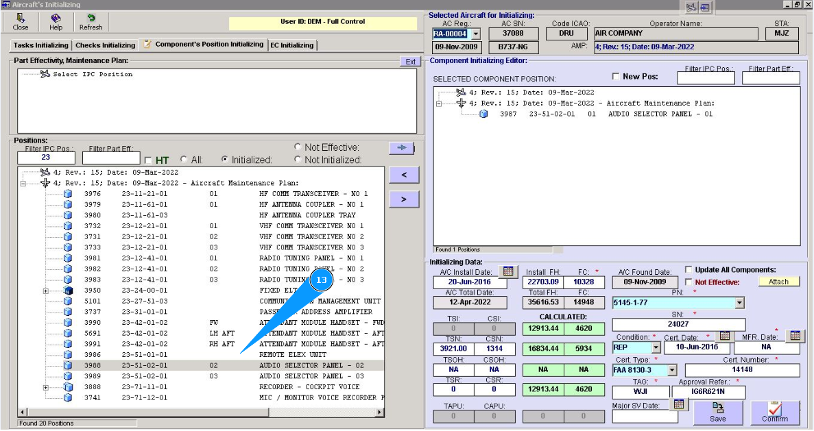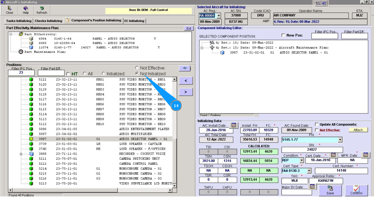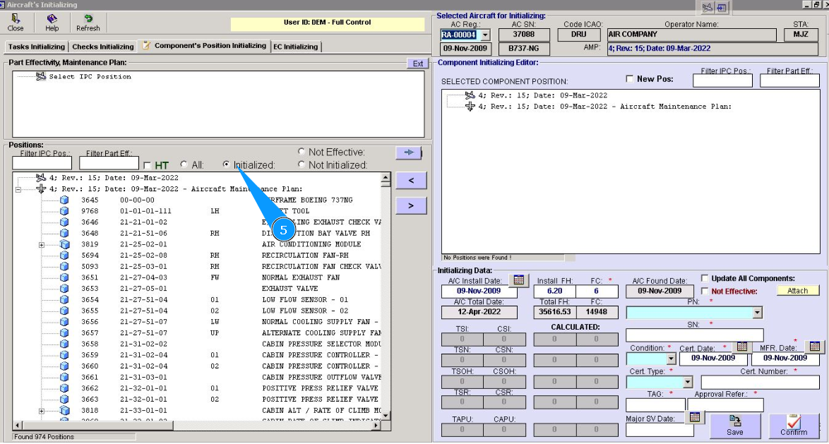 15. Check that the corresponding position is displayed in the window of non-initialized positions.