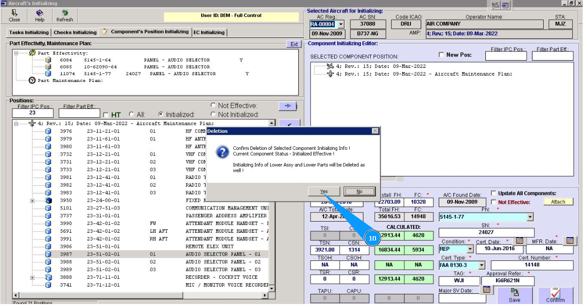 10. Click on the button "Yes", to confirm the deletion of the initializing component position.