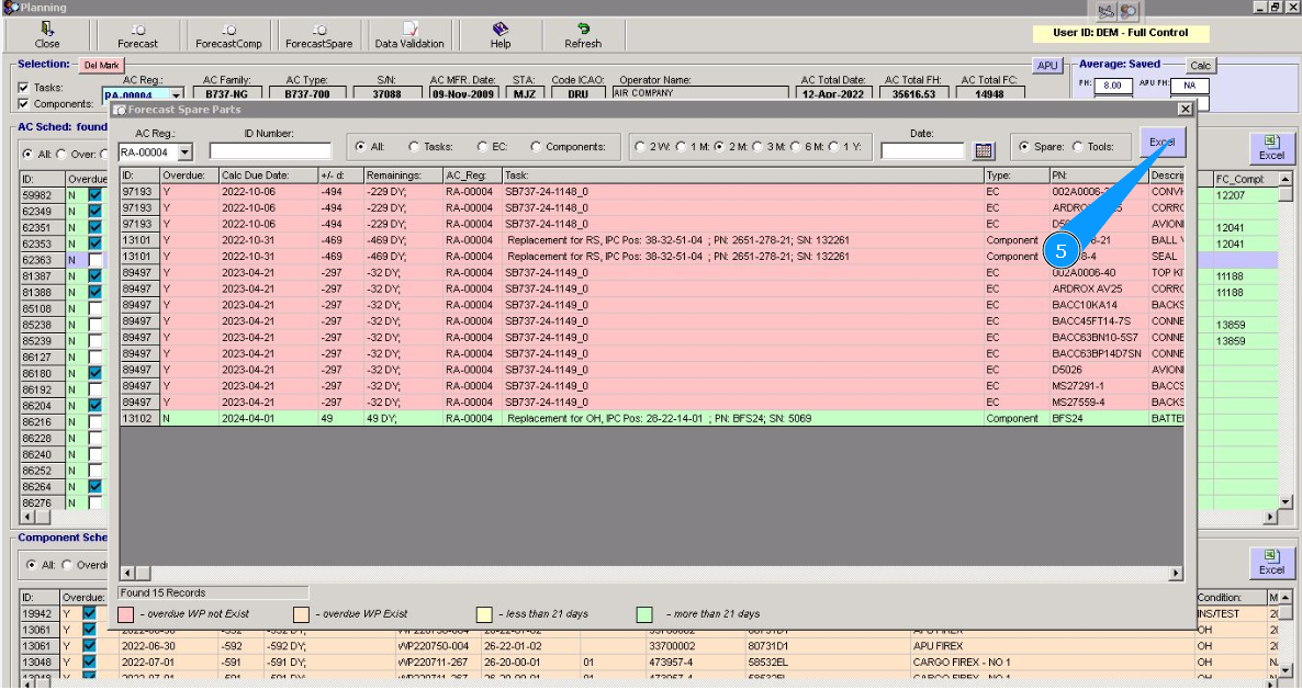 5. Click on the button "Excel, to download data about forecast to excel. Note: Use the existing search filters to select the appropriate Task, EC or Component for which the Excel report should be downloaded, and select the forecast interval as well.
