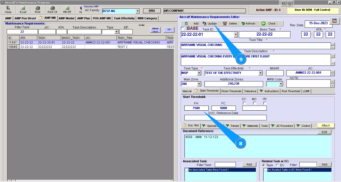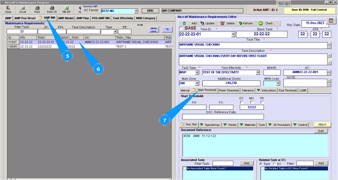 7. Then go to the tab "Start Threshold" in the editor "Aircraft Maintenance Requirements Editor".