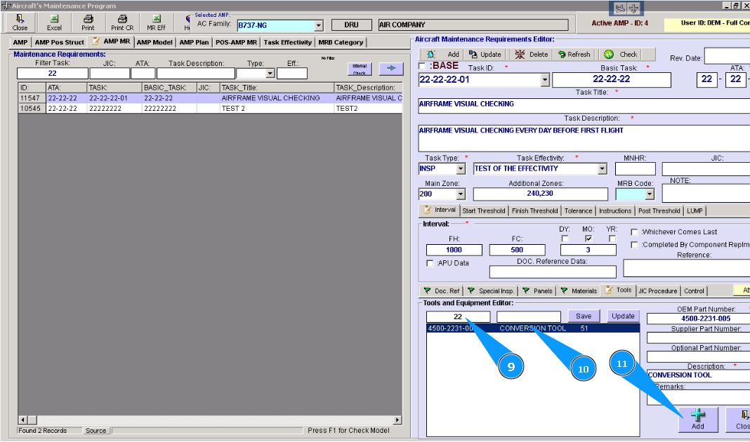 1. For adding tools or equipment to the AMP task, please go to submodule "AMP- Maintenance Program".