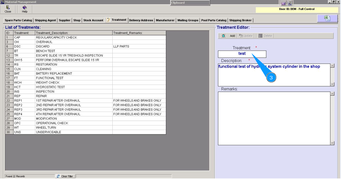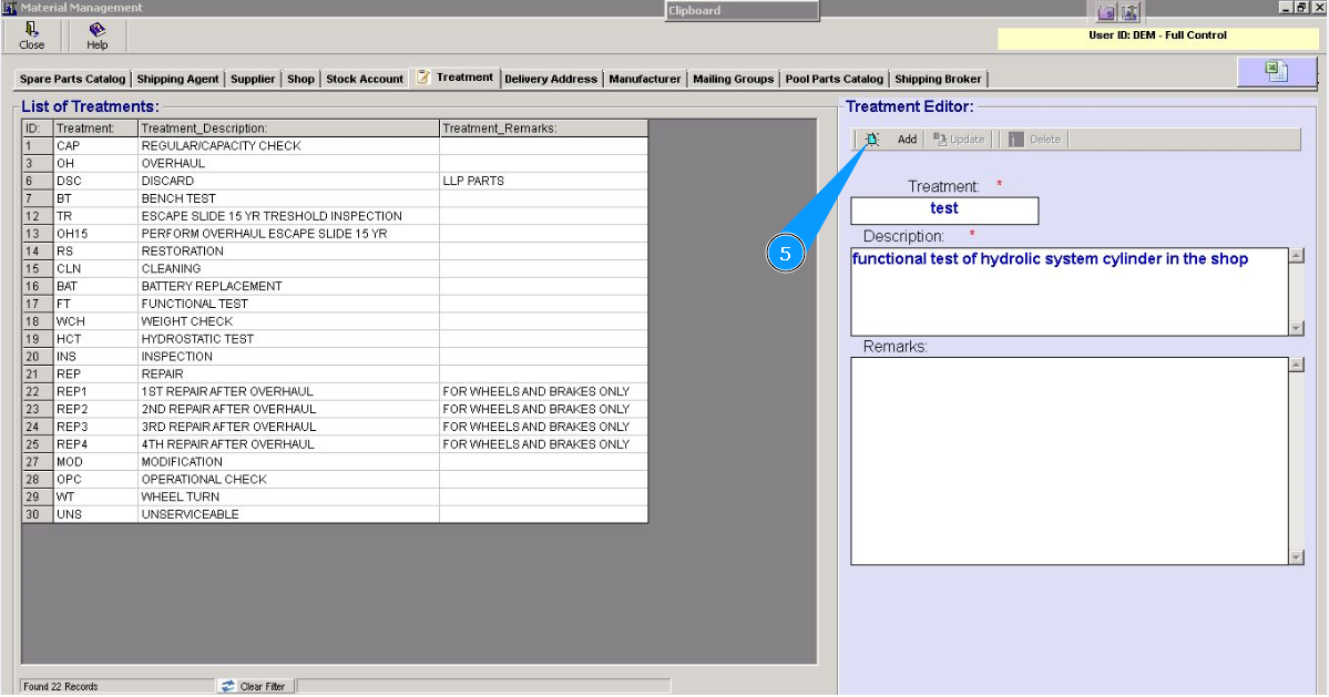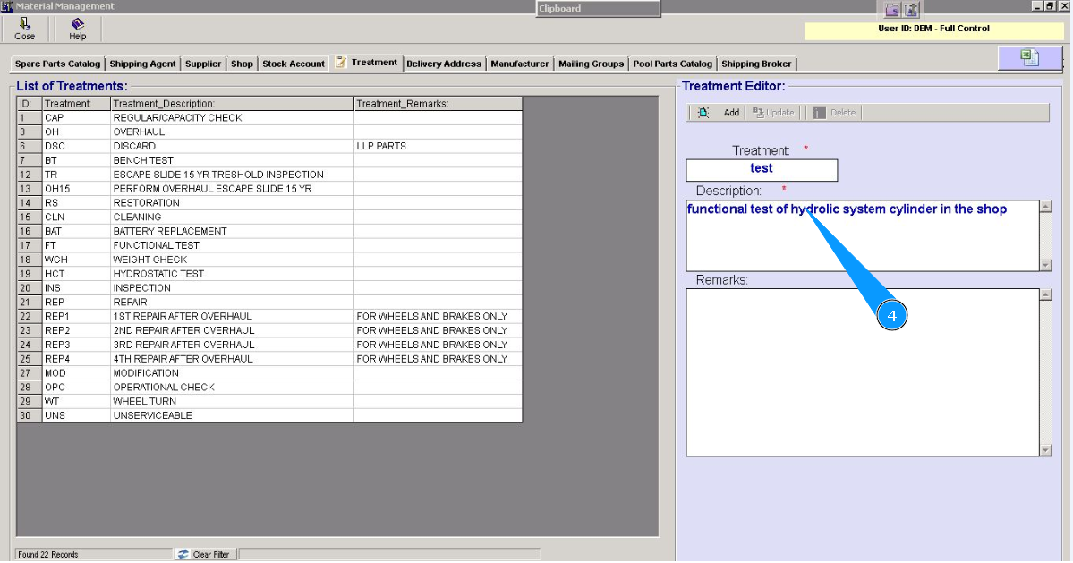4. Enter the description of the newly created treatment in the field "Description". Note: If necessary, enter your comments in the field "Remarks".