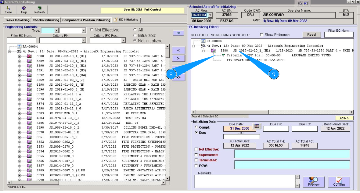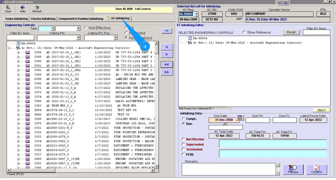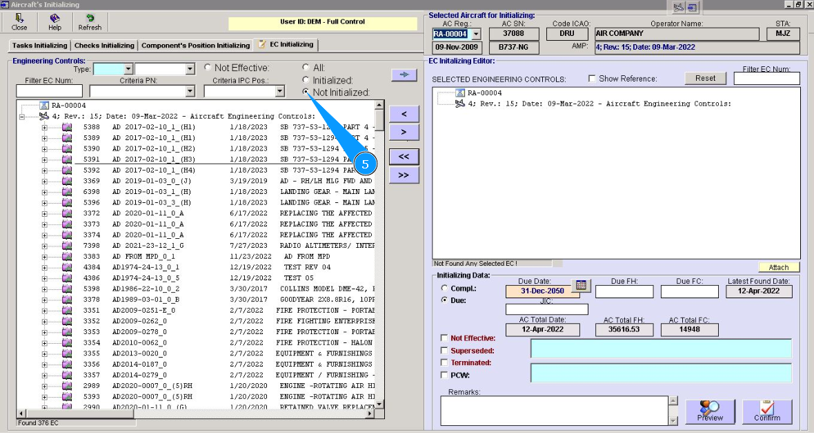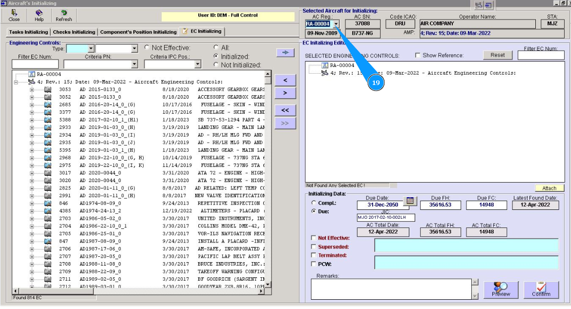 19. Perform EC initializing for all aircraft in your company fleet. Select the next registration number from dropdown list in the field "AC Reg.". Repeat items from 5 to 18 of this instruction.