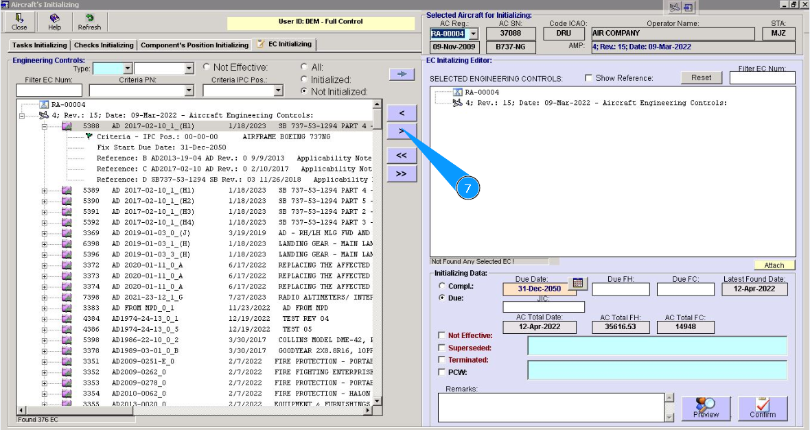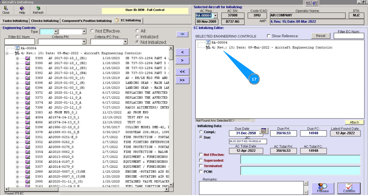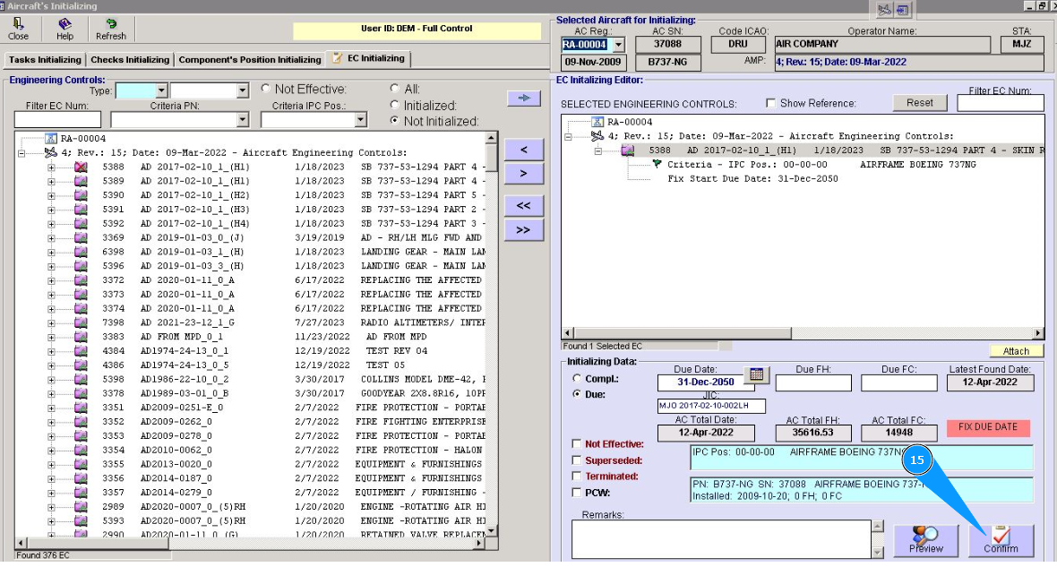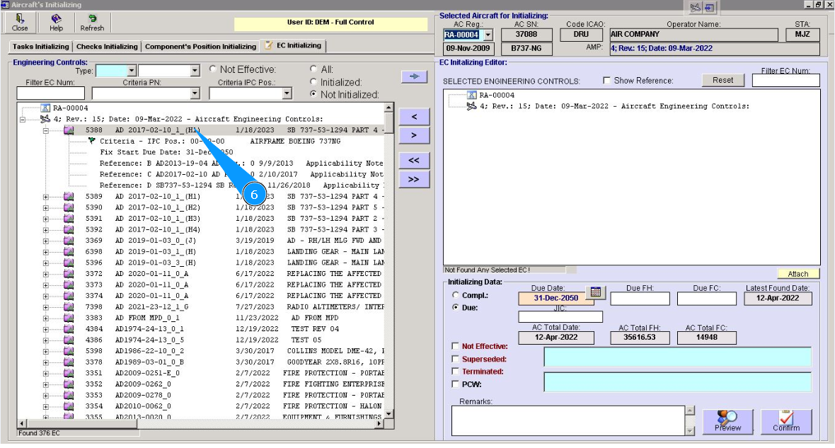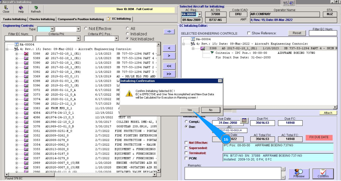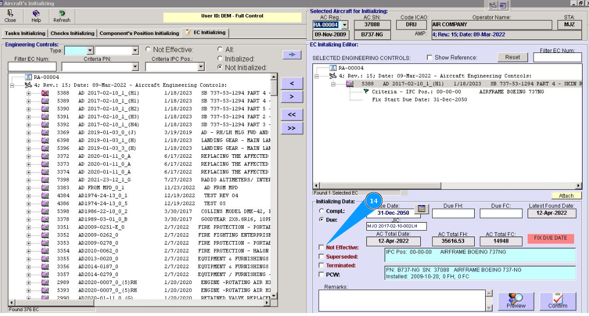 14. Identify the applicability of this EC to aircraft registration. If it is not effective, click in on the window "Not effective.