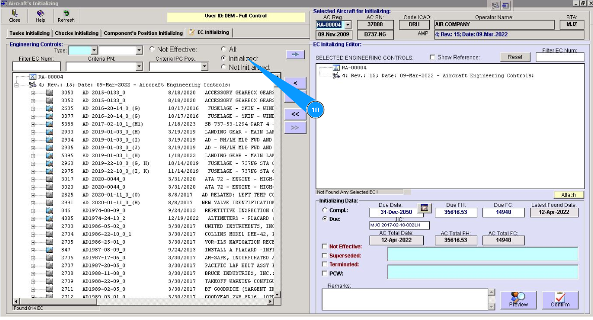 18. Check that the selected EC is presented in the window of the initialized EC of window "Engineering Controls". In this case, set a filter in the field "Initialized".