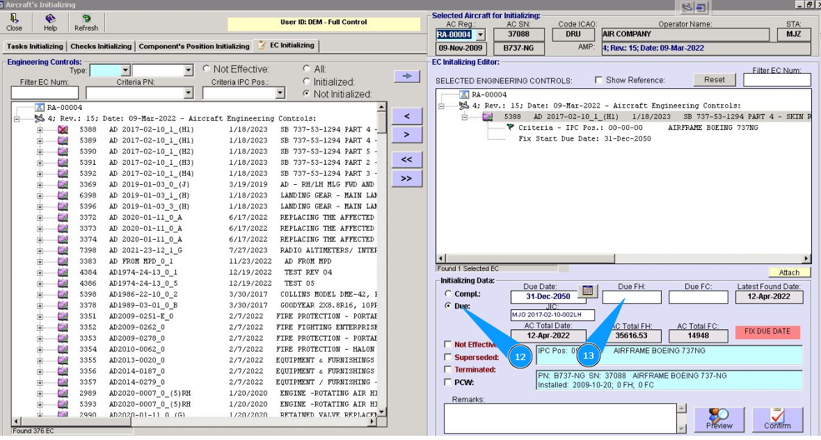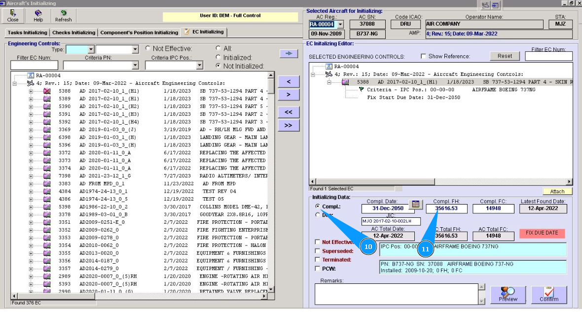 11. Enter information about the last performing of EC, if it is applicable, in the fields "Compl.Date, "Compl.FH, "Compl.FC.