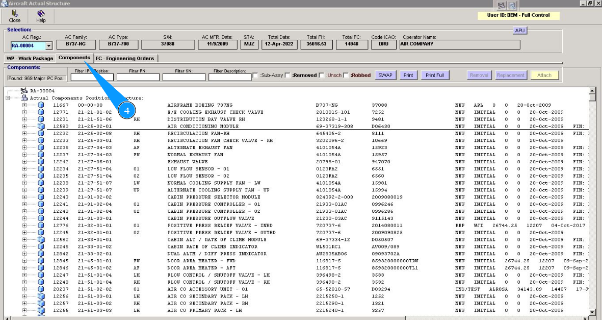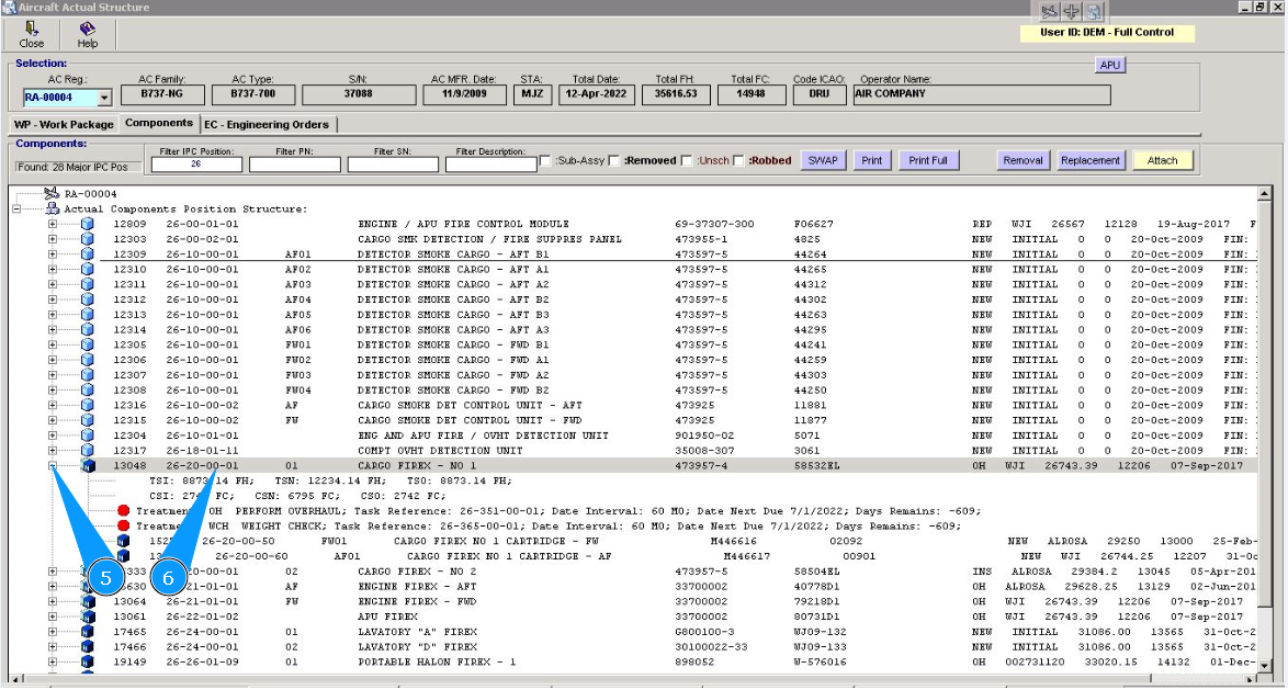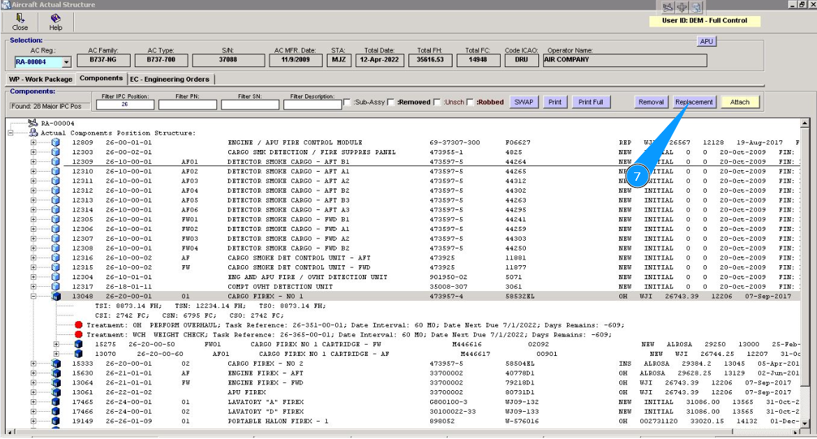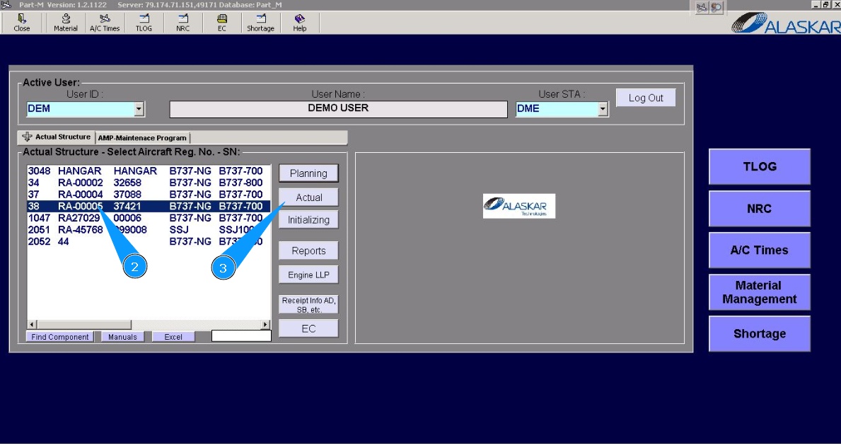 2. Select the aircraft registration number from the list in the window "Actual Structure-Select Aircraft Reg.-SN".