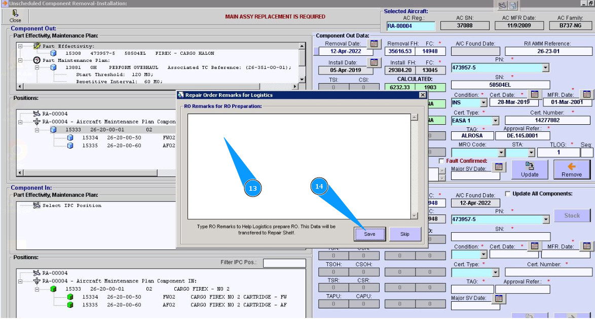 13. If necessary, enter the data for removal. There are some comments about removing or repairing order preparation in the window, "Repair Remarks for RO preparation".