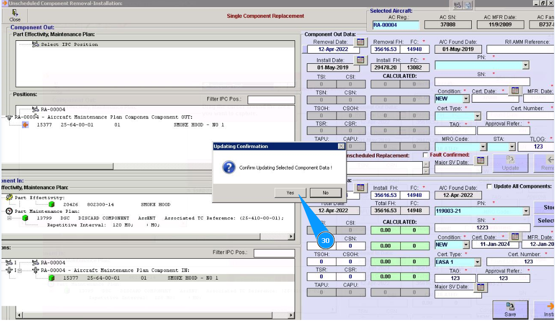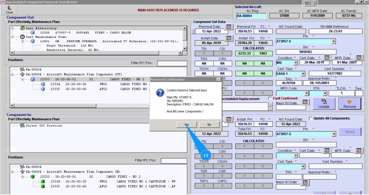 15. Click on the button "Yes", to confirm the removal of the component from its position.