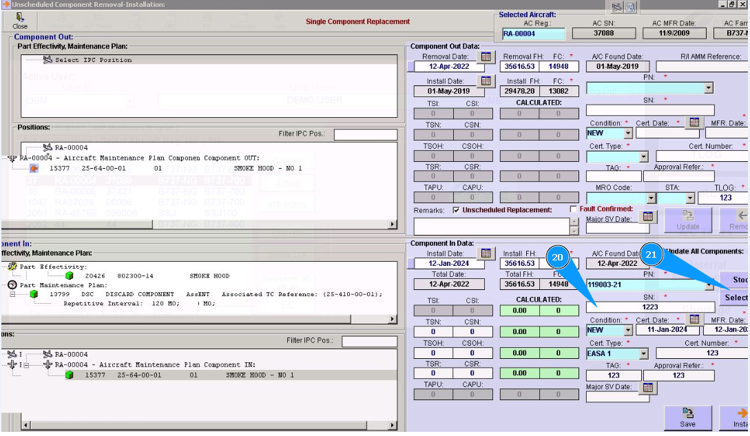 20. Enter the serial number of the installed component in the field "SN". Note: Check the installation date, this date is current by default. If necessary, you can correct it.