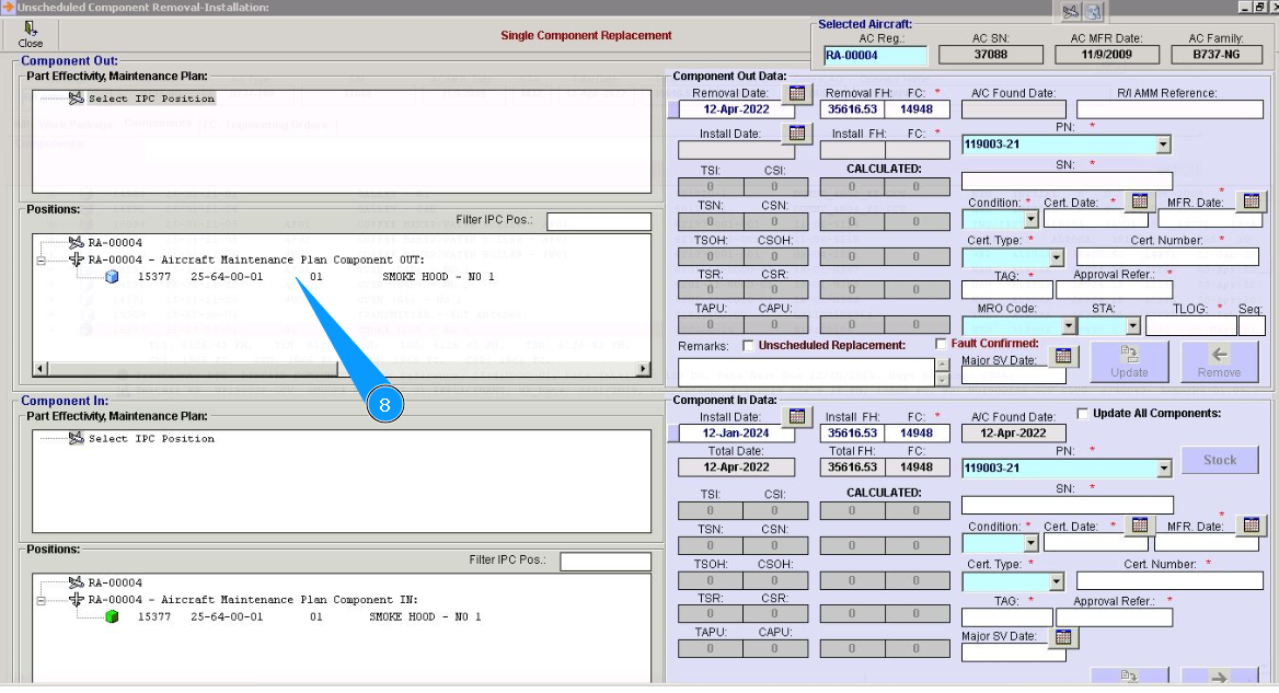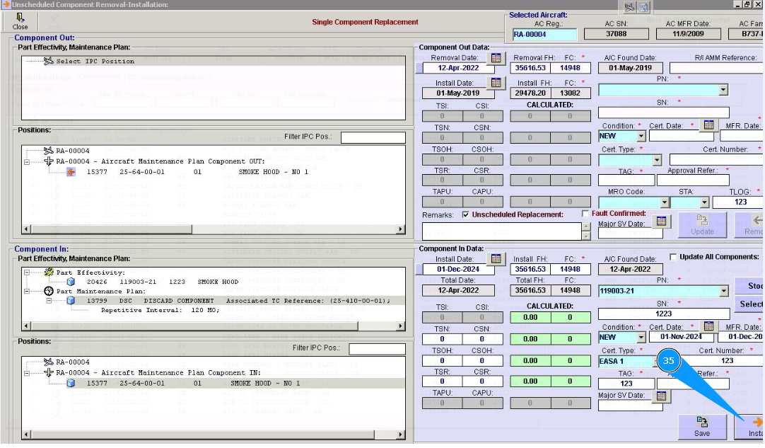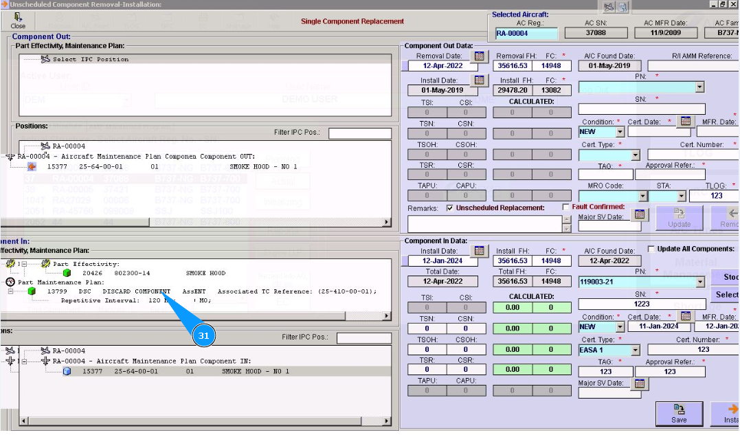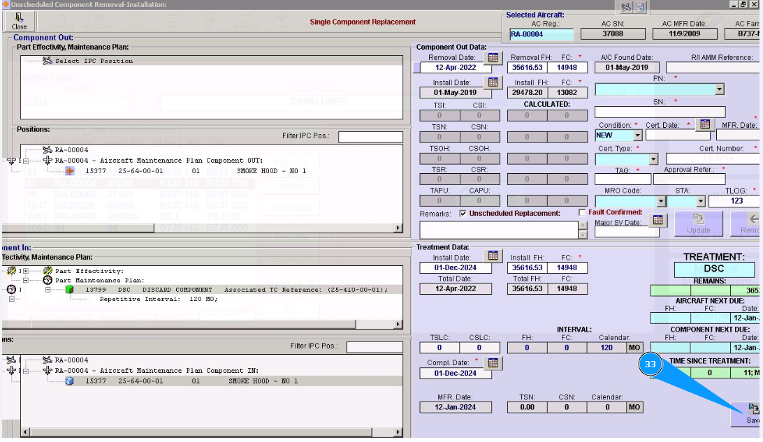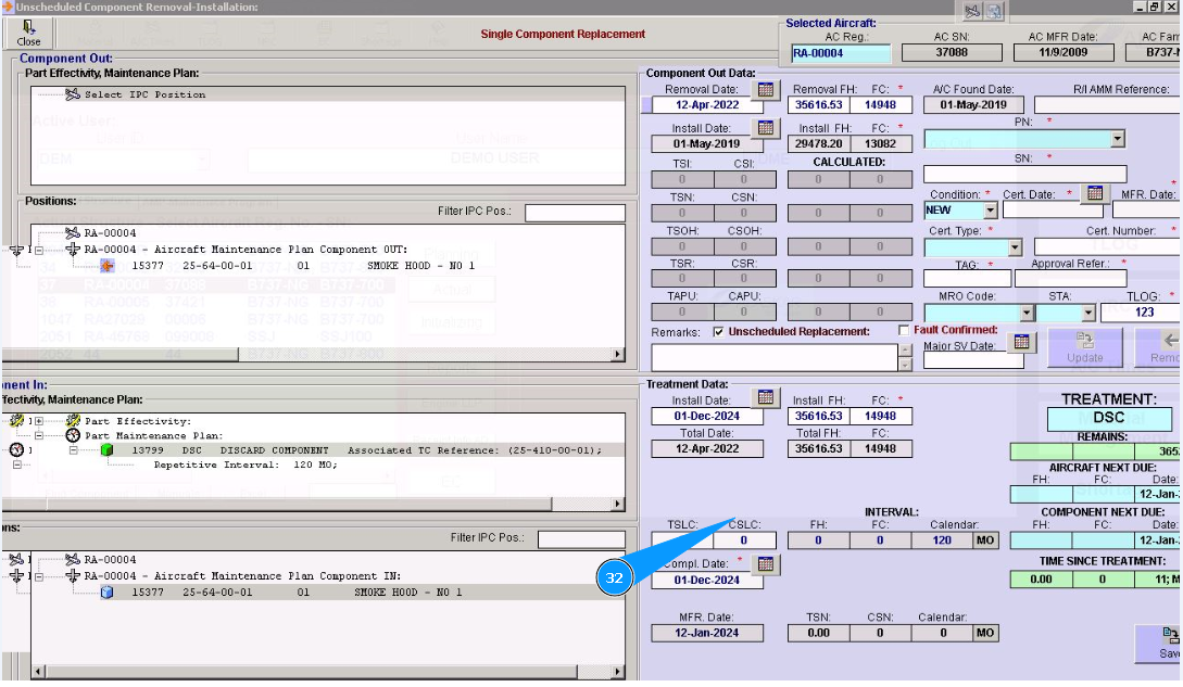 31. Click on the line of treatment in the window "Component In" and chapter "Part Maintenance plan". Note: Treatment lines for components are presented of hard time components only.