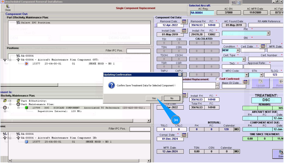 34. Click on the button "Yes", to save treatment data of component to program.