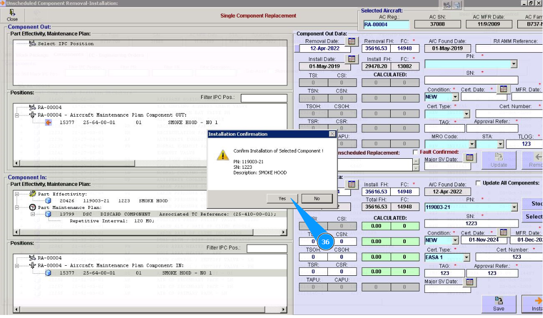36. Click on the button "Yes", to confirm component installation on board.