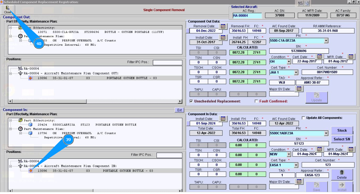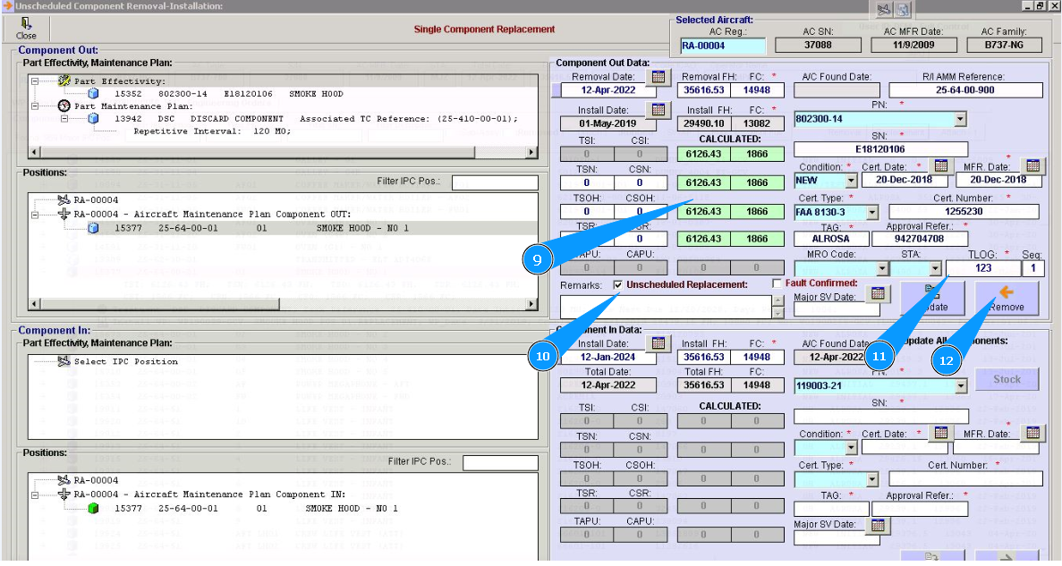 10. Click in the window "Unscheduled Replacement", if replacement is performed after component failure.