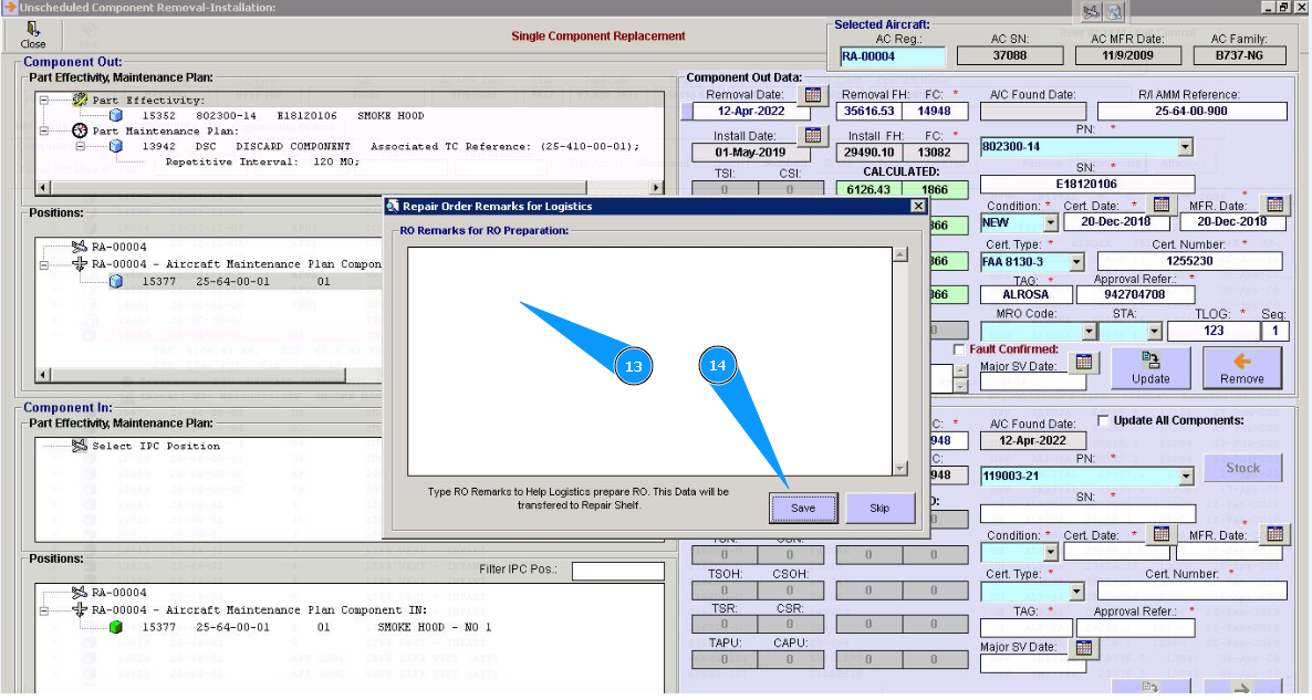 13. If necessary, enter the data for removal. There are some comments about removing or repairing order preparation in the window, "Repair Remarks for RO preparation".