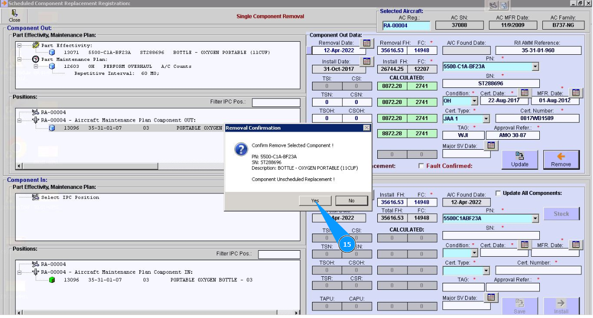 15. Click on the button "Yes", to confirm the removal of the component from its position.