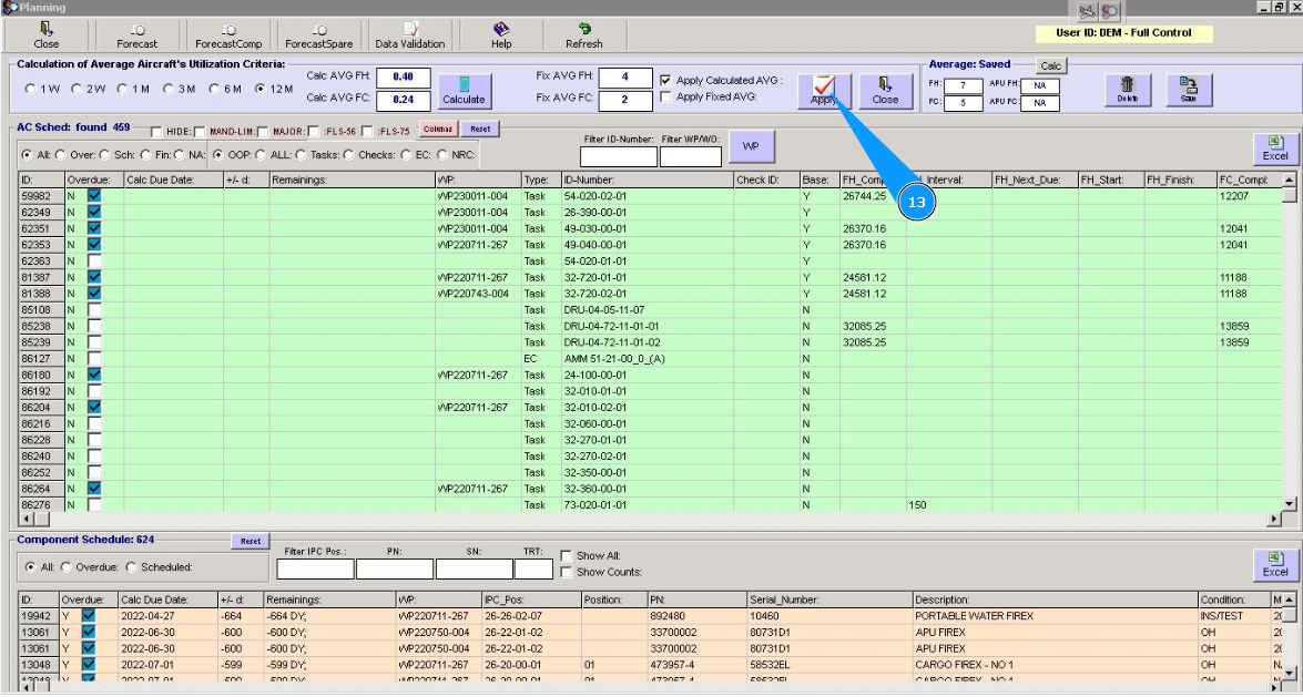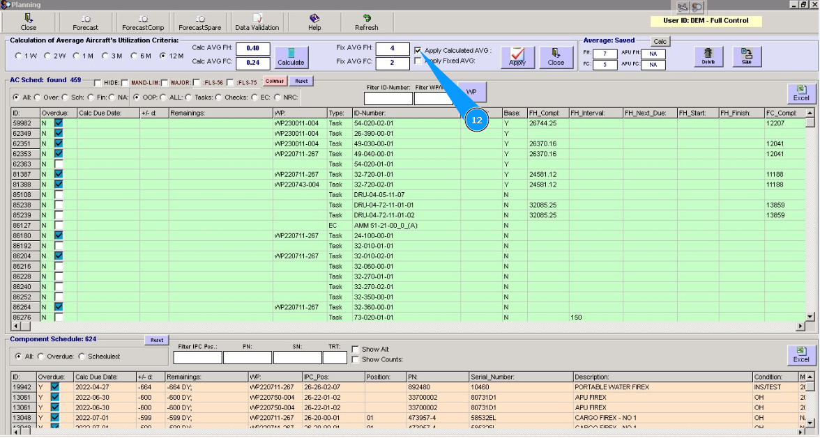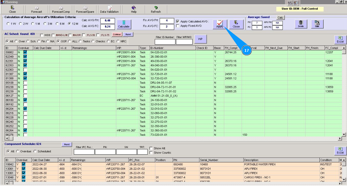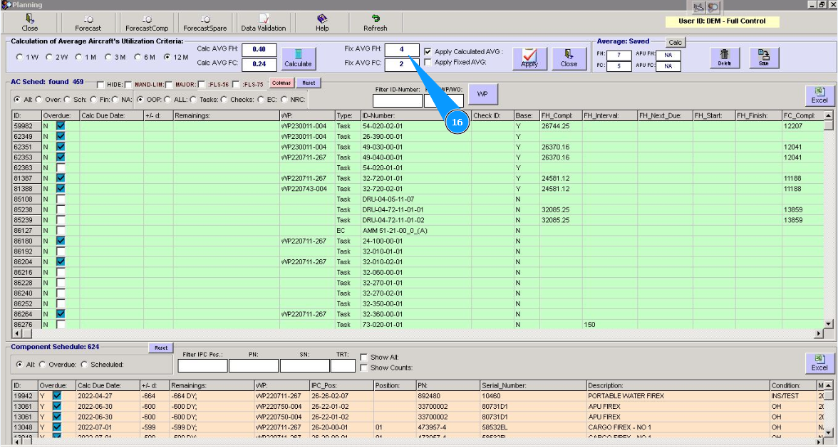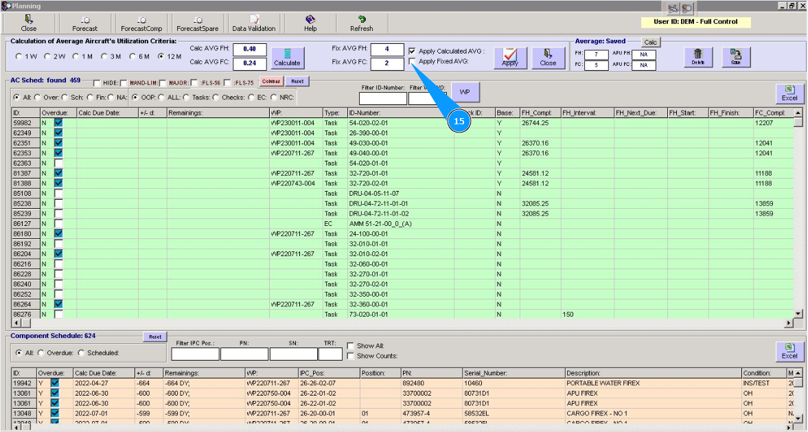 15. In this case, set the filter "Apply Fixed AVG", to calculate deadlines for task planning based on your requested AVG aircraft utilization.