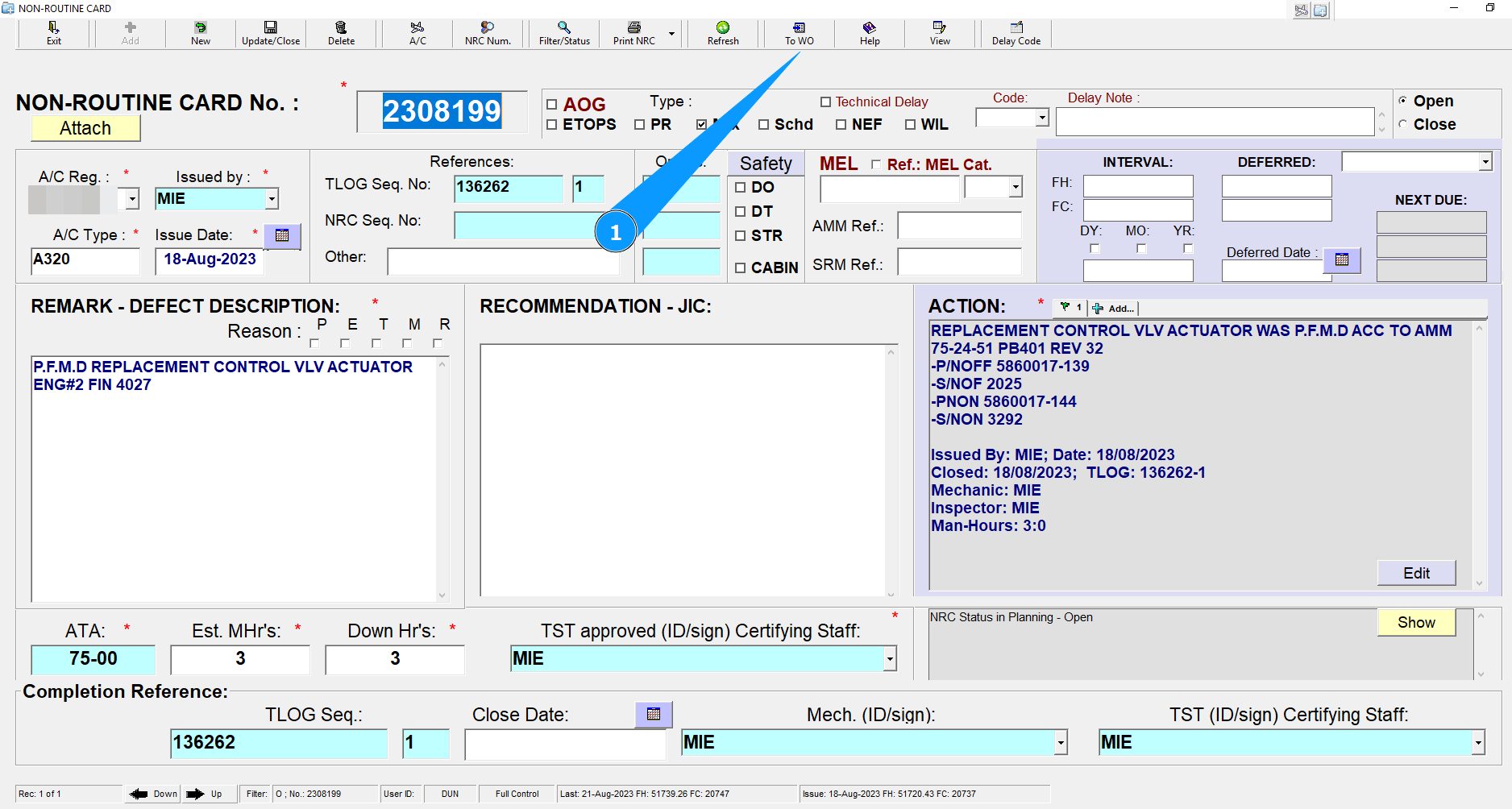 1. In order to Transfer Data from a selected NRC to a newly creating Line Maintenance WO record, press "To WO" Button.