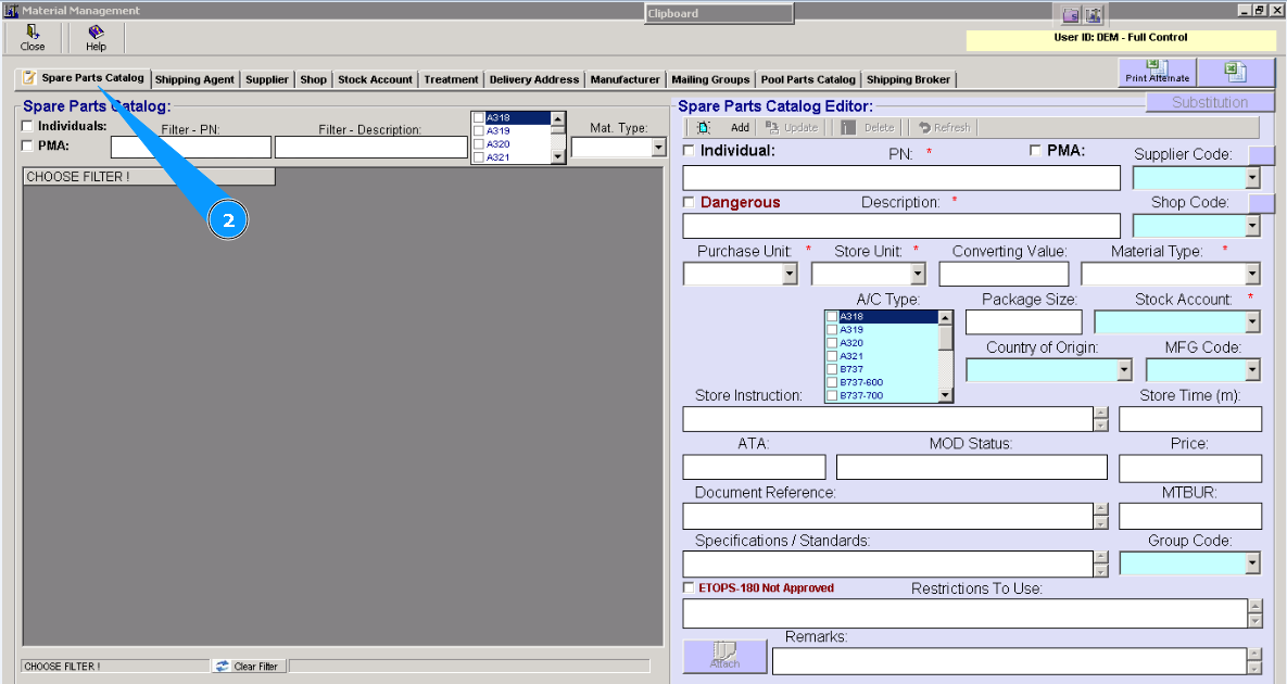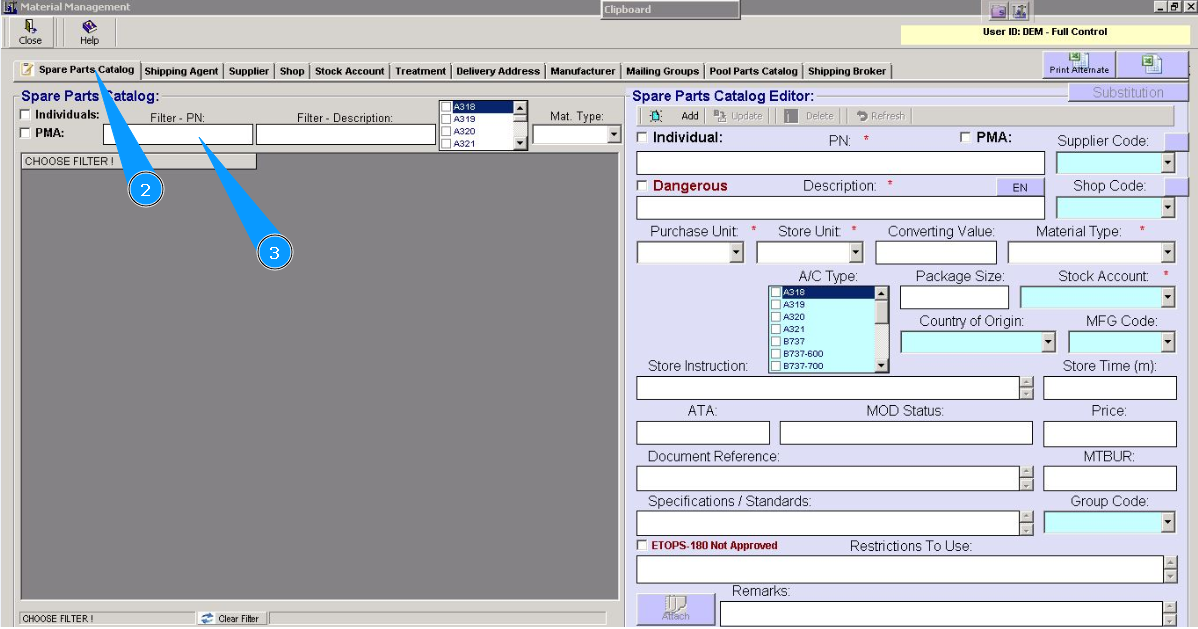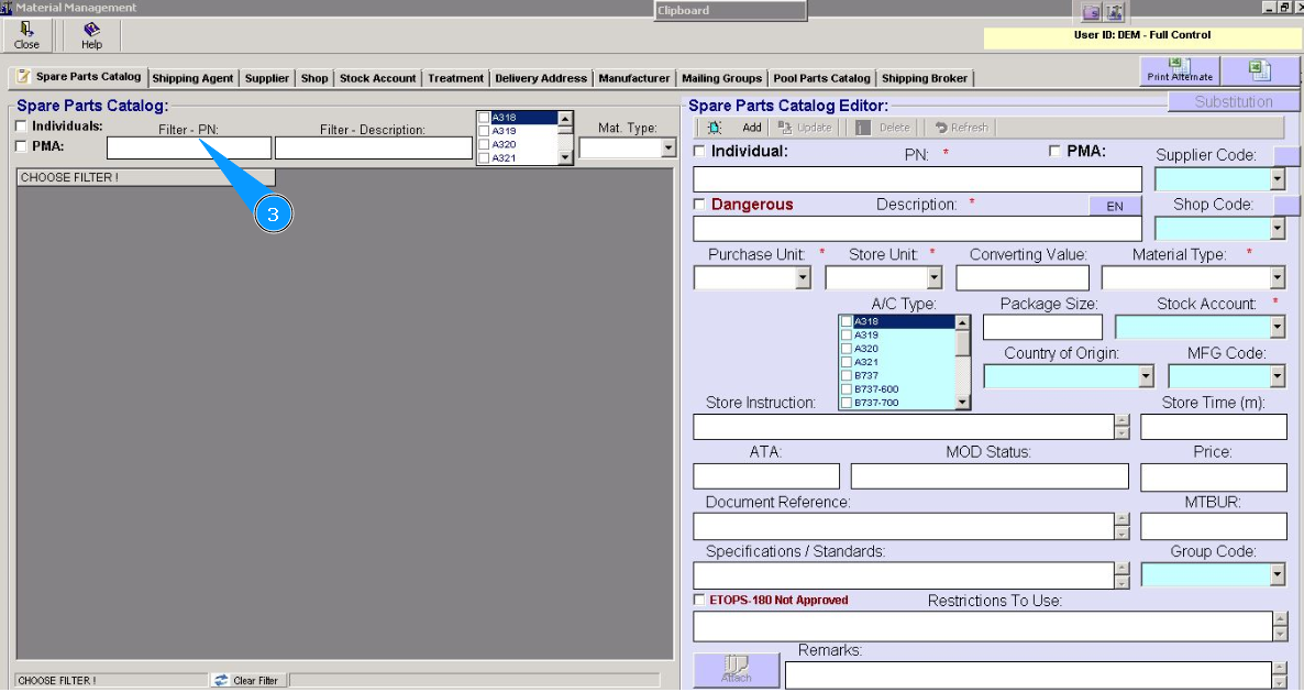 3. Enter the part number in the window "Filter-PN" and click on the button "Enter" on your keyboard, to search for the required unit. Note: If necessary, use other available filters in the window "Spare Parts Catalog".