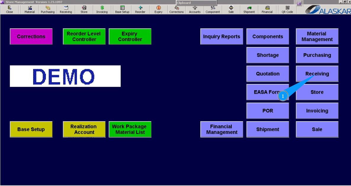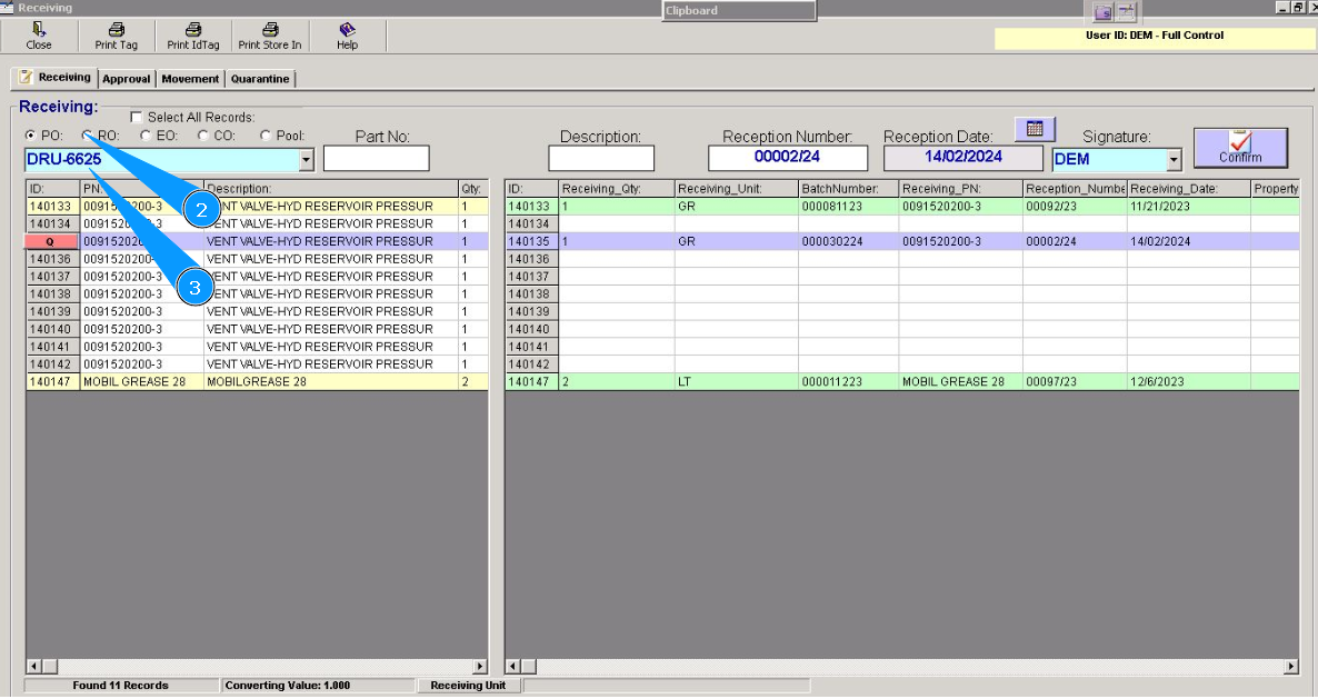 2. Then in the tab "Receiving", select one of the ordered type: PO, RO, EO, CO, Pool. Note: Receiving component is available if you know the nimber of order from list: PO,RO,EO,CO,Pool.