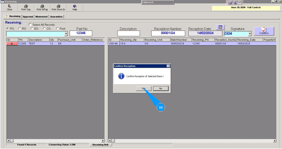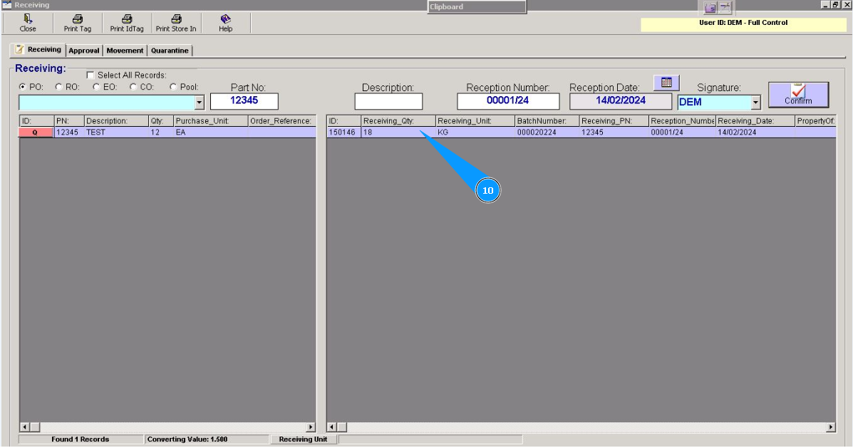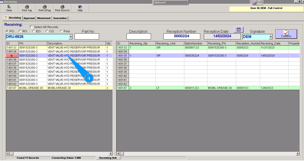 11. Check that unit was successfully received on store in the right part of window "Receiving".