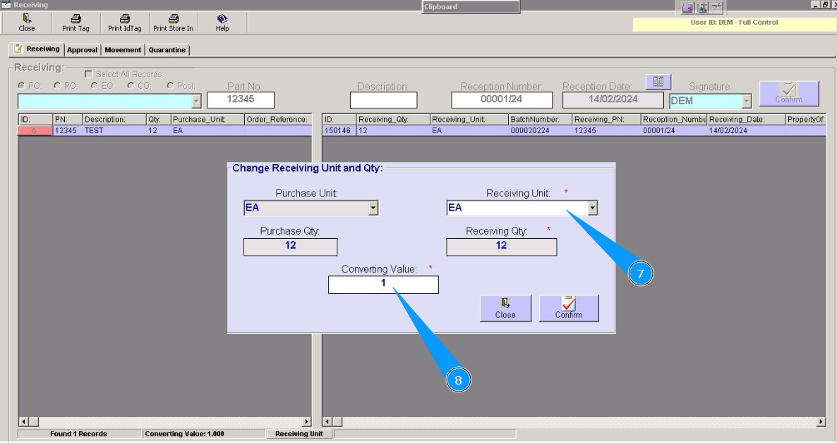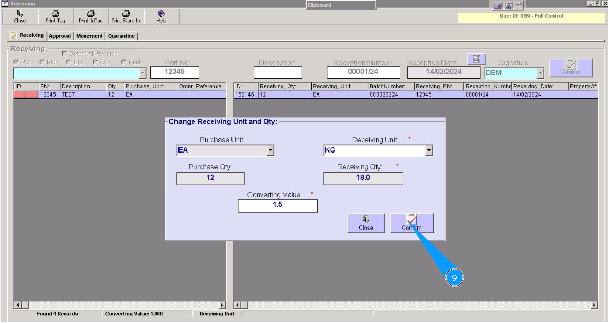 7. Select from dropdown list required store unit (E.A., KG, etc.) in the window "Receiving Unit".