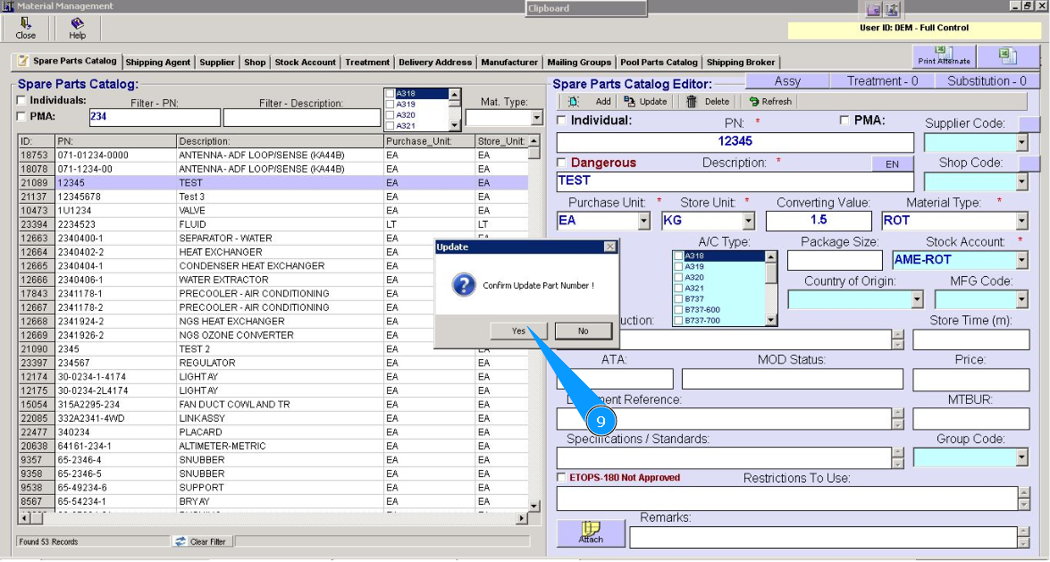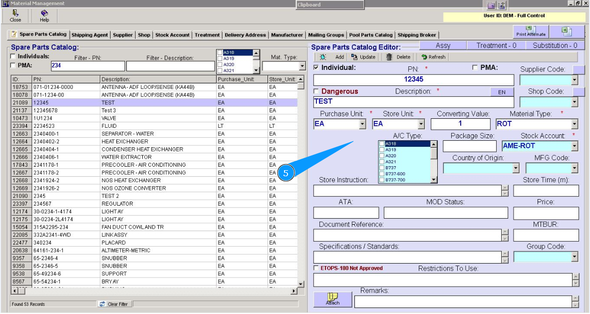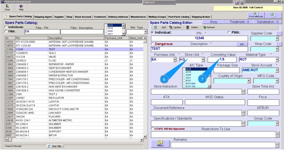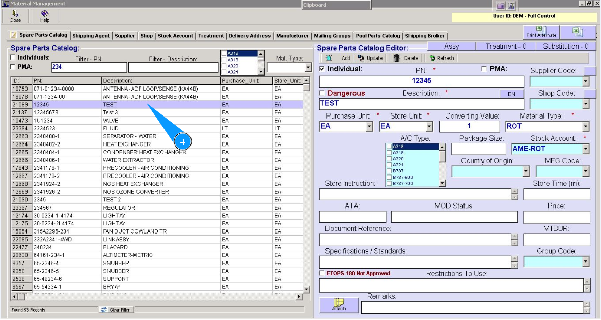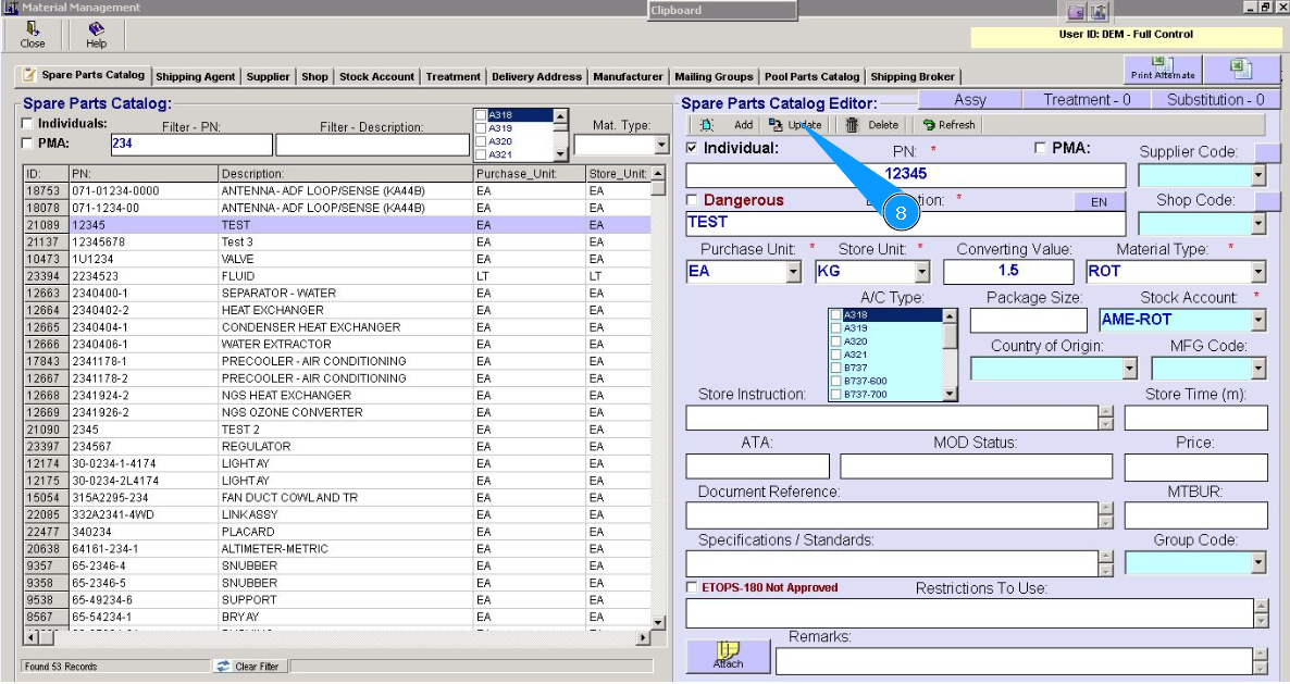 5. Check that data of required and selected unit is presented in the window of editor "Spare Parts Catalog Editor".
