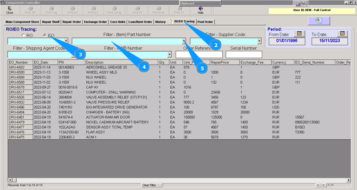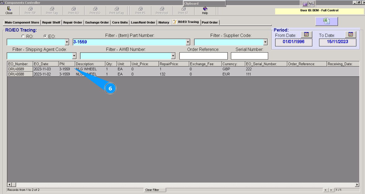 2. Then, go to the tab "RO/EO Tracing". Note: If necessary, you can use other searching filters for a more exact selection of lines with the requested Exchange Order.