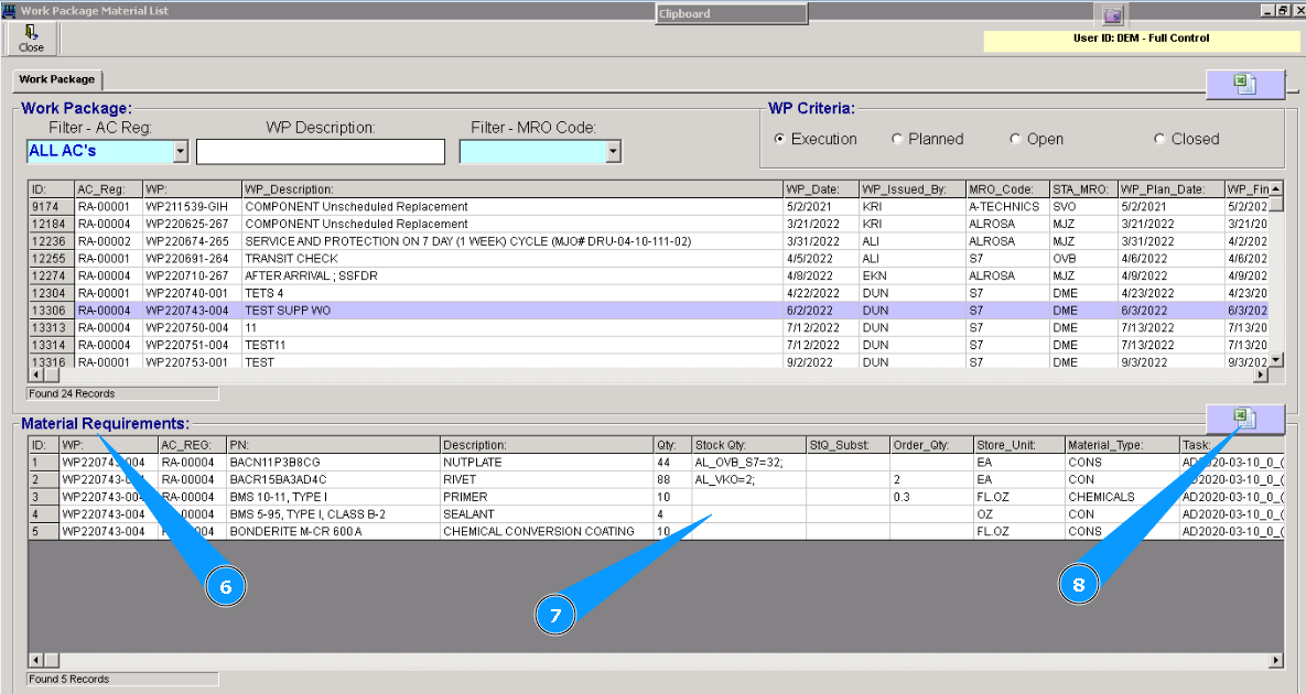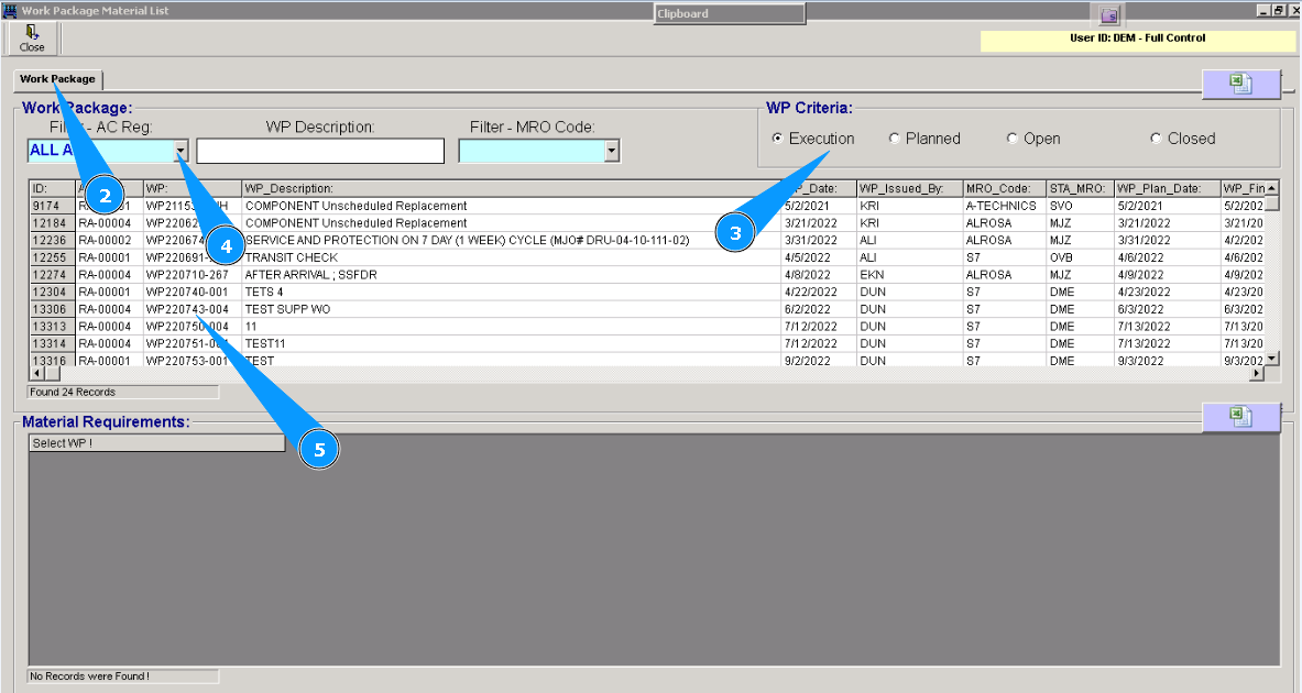 3. Find the necessary WP for checking materials with the available filters "Filter-AC Reg", "WP Criteria", or others. Enter searching creation in the field, for example: WP number, and press the button "Enter" on your keyboard.